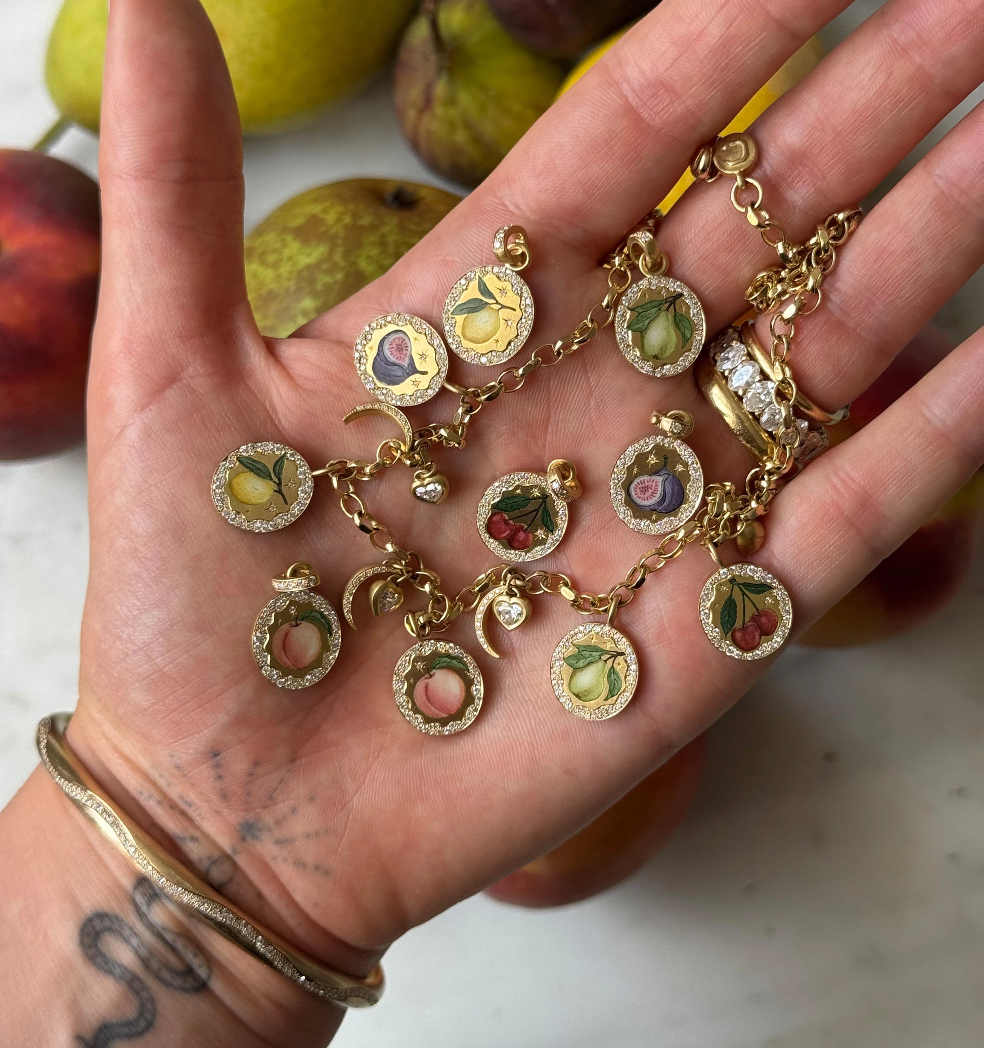 Each ring starts its journey in Cece’s London workshop, made by hand and forged from beautifully deep and rich recycled 18ct yellow gold. The ring is then passed on to one of London’s most renowned enamelers where every design is hand engraved and then hand painted using fire and crushed glass to create each design perfectly. Finally, the ring is embellished with pearls and star-set diamonds to complete each miniature scene. This meticulous and precious process means every ring is individual to the wearer, a mystical heirloom that will last generations.