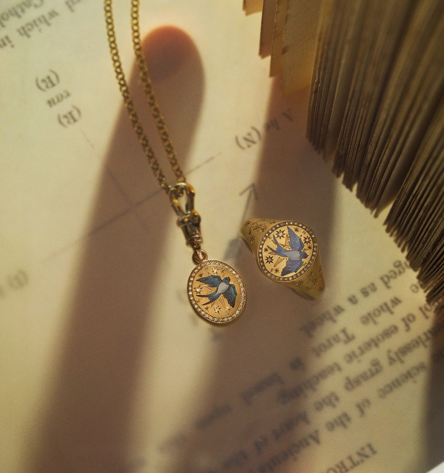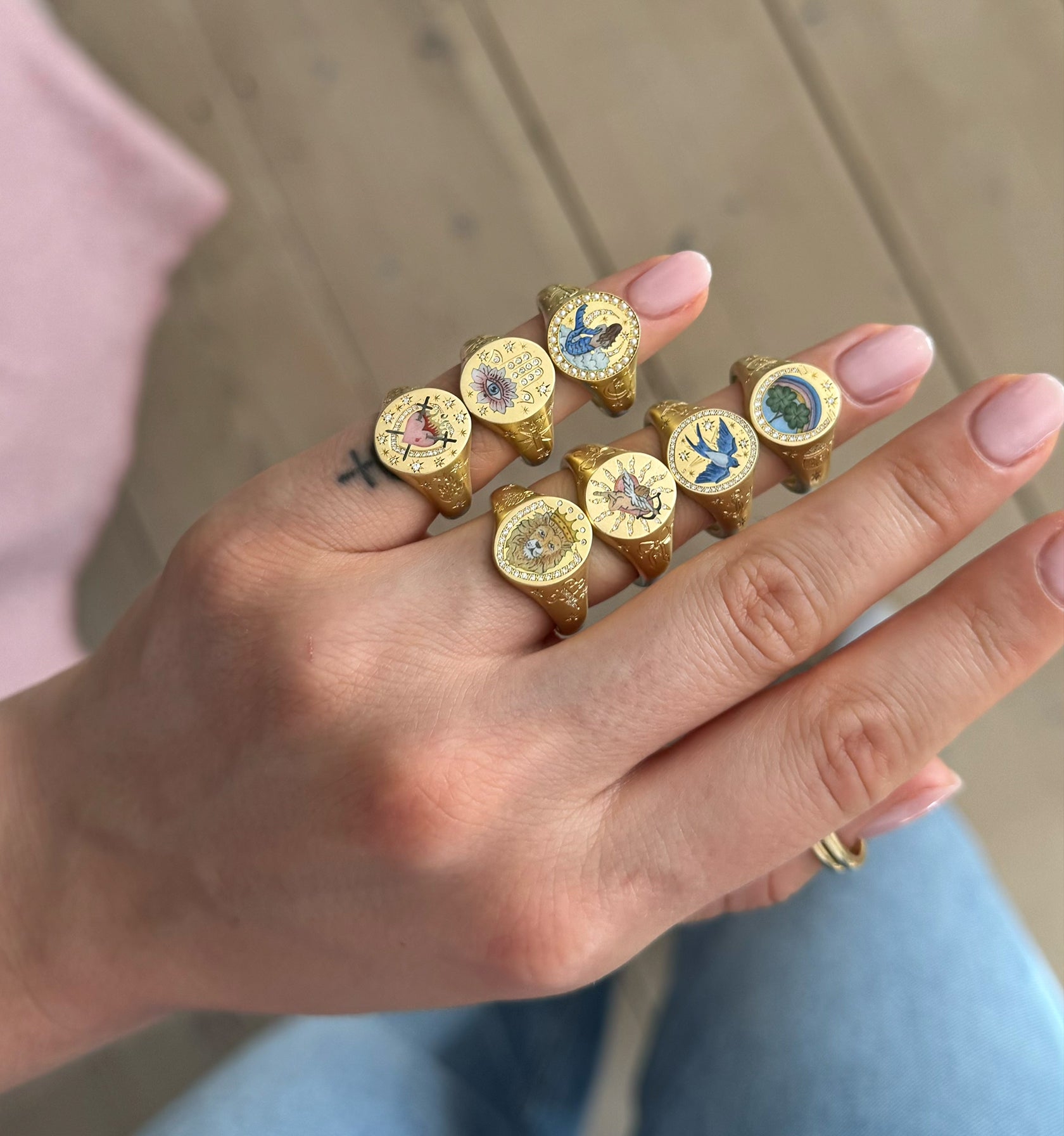 Each ring starts its journey in Cece’s London workshop, made by hand and forged from beautifully deep and rich recycled 18ct yellow gold. The ring is then passed on to one of London’s most renowned enamelers where every design is hand engraved and then hand painted using fire and crushed glass to create each design perfectly. Finally, the ring is embellished with pearls and star-set diamonds to complete each miniature scene. This meticulous and precious process means every ring is individual to the wearer, a mystical heirloom that will last generations.