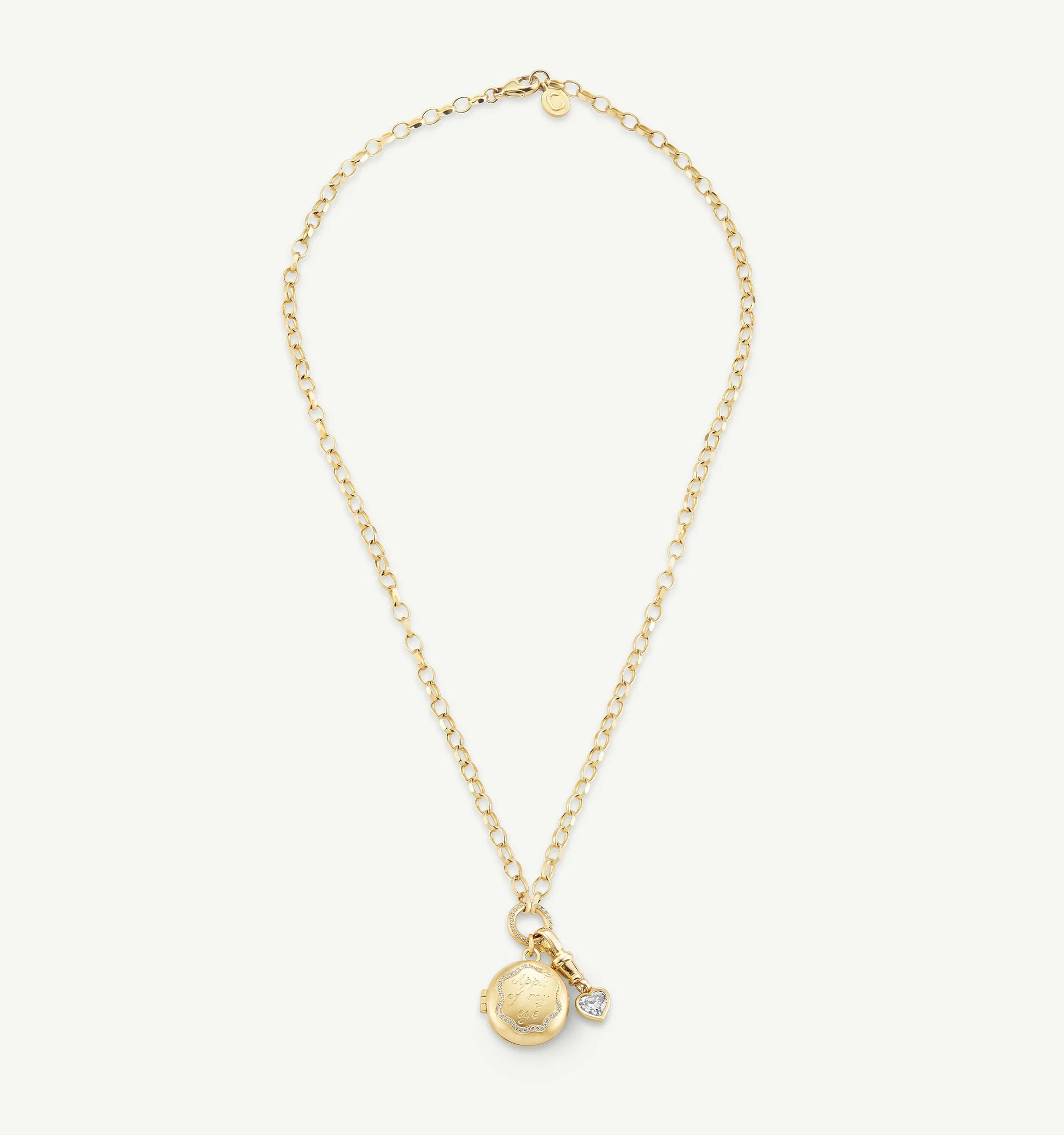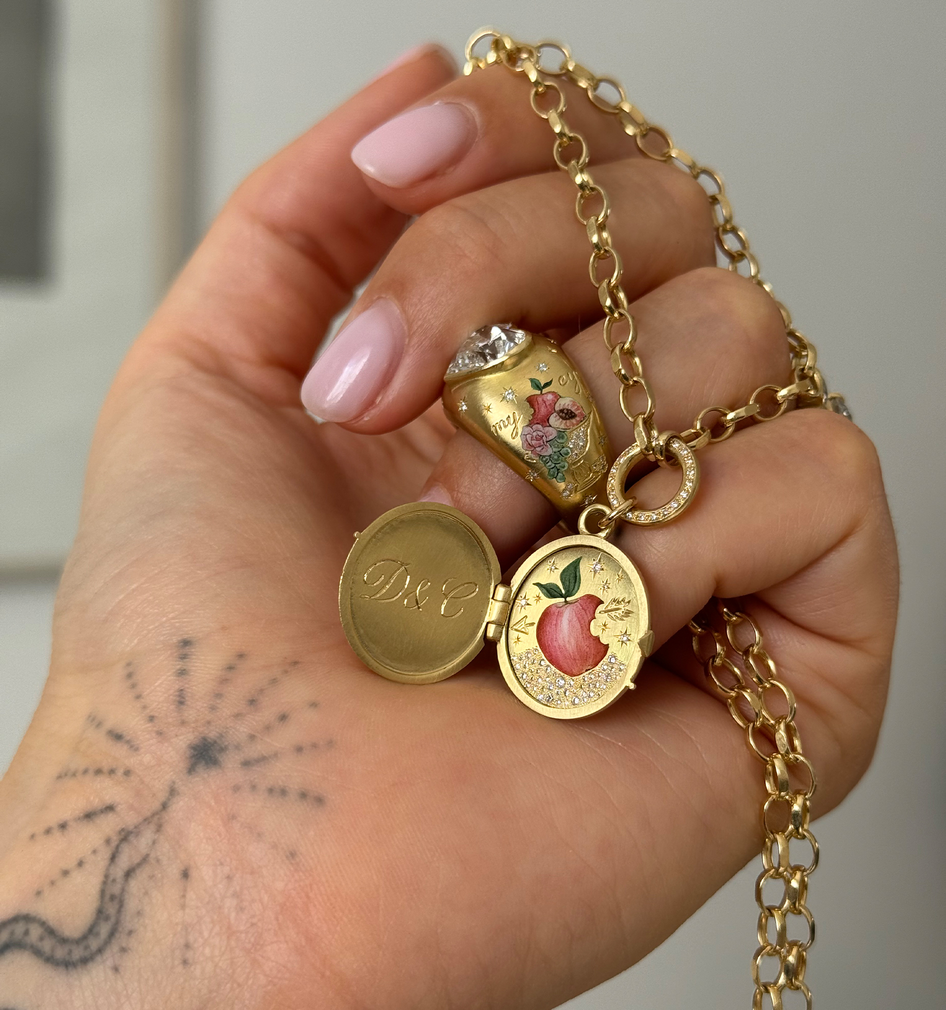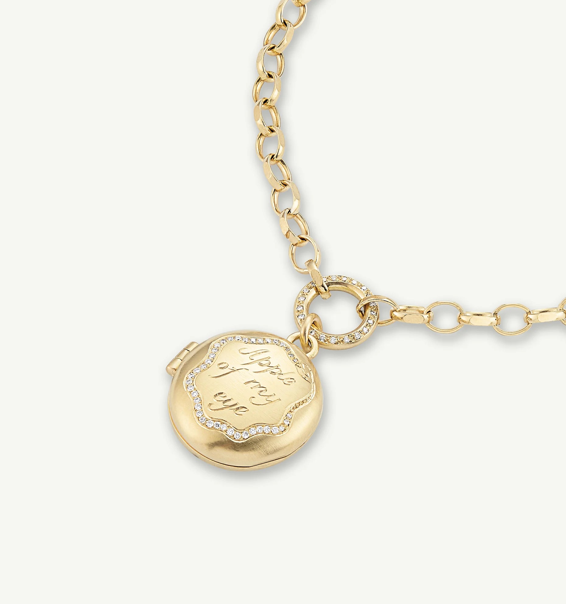 The face of the locket is hand-engraved with the message ‘Apple Of My Eye’ and an enchanting snake with diamond scales.
