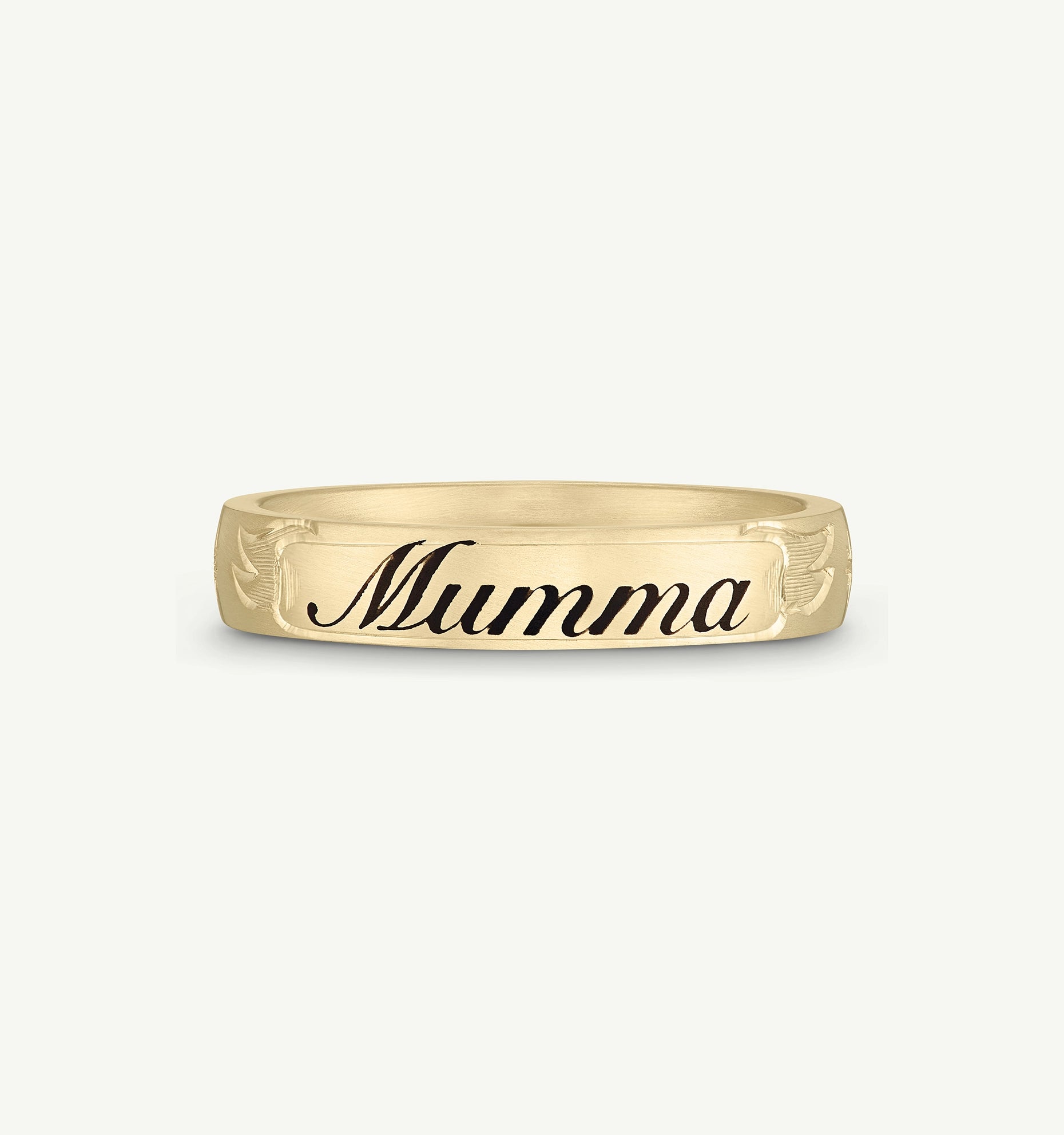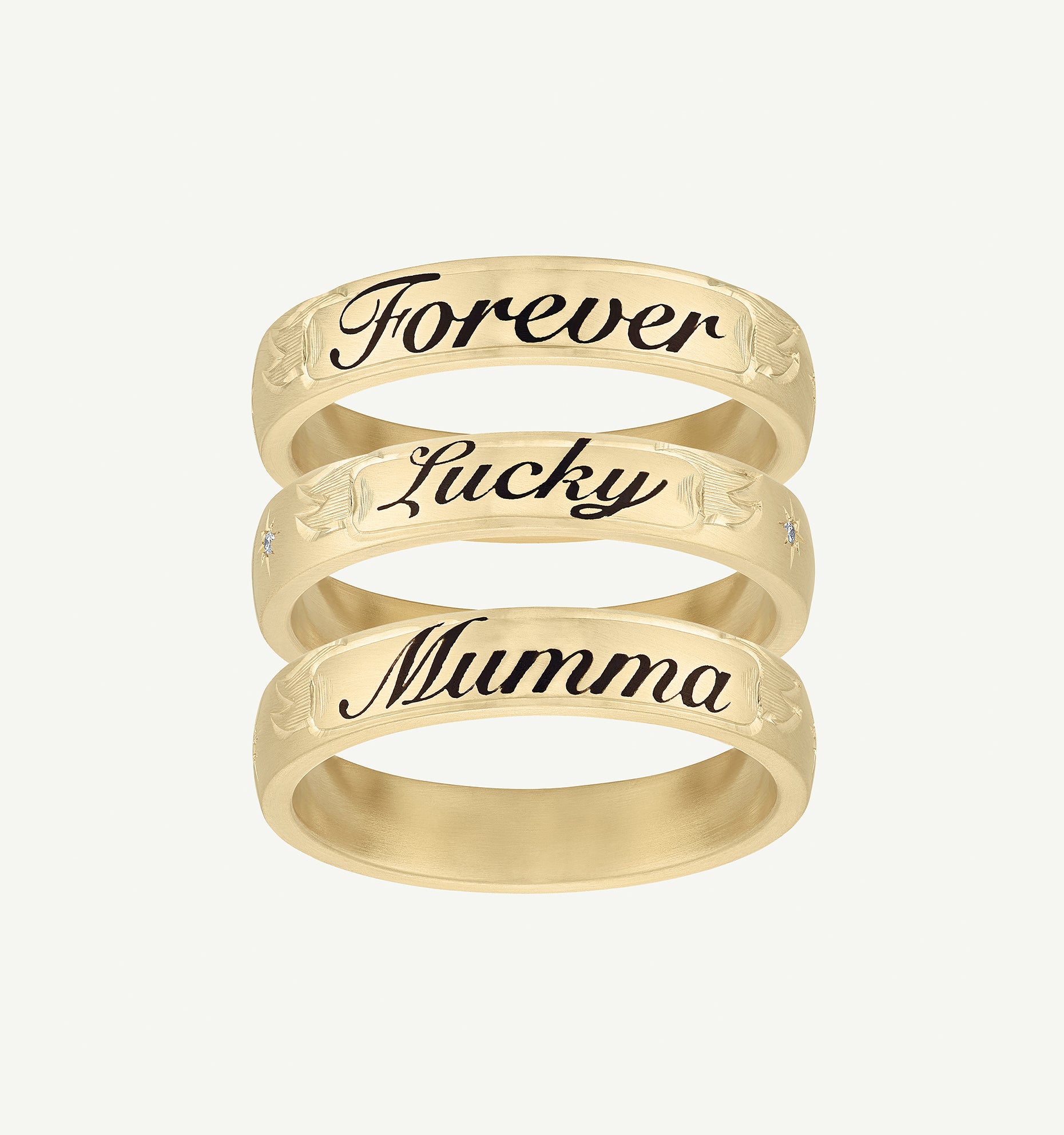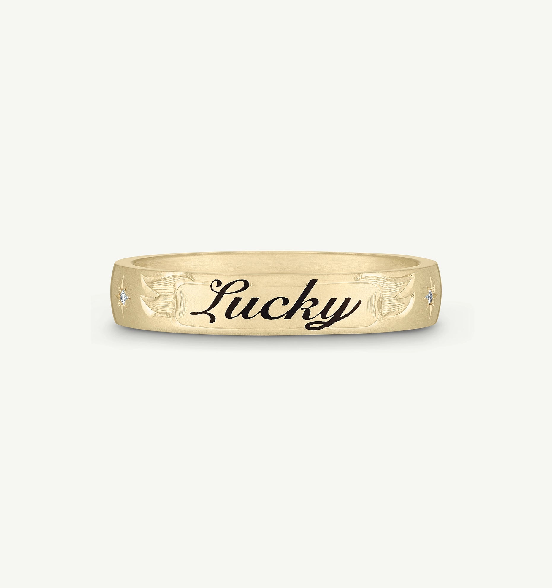 A modern and luxurious take on a classic tattoo style, the Custom Script Band Ring is iconically Cece. Made to stack and to live in, it becomes your everyday signature. A mark for life, sans needle.