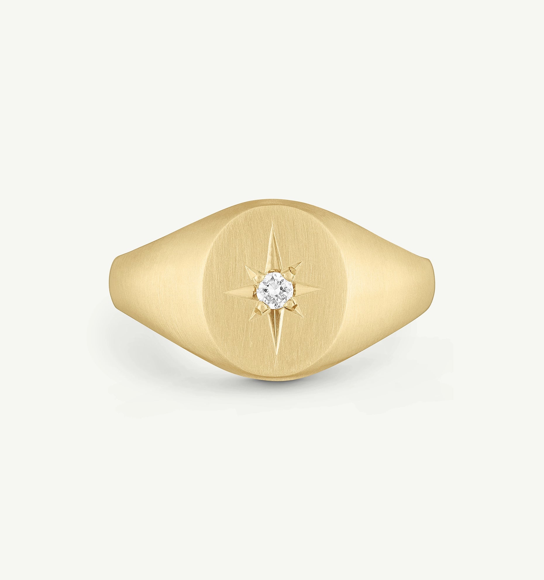Like a tattoo, the signet ring is a mark of identity and belonging. Here, the frosted 18ct gold signet face is adorned with a single star-set diamond, giving it a signature Cece edge.