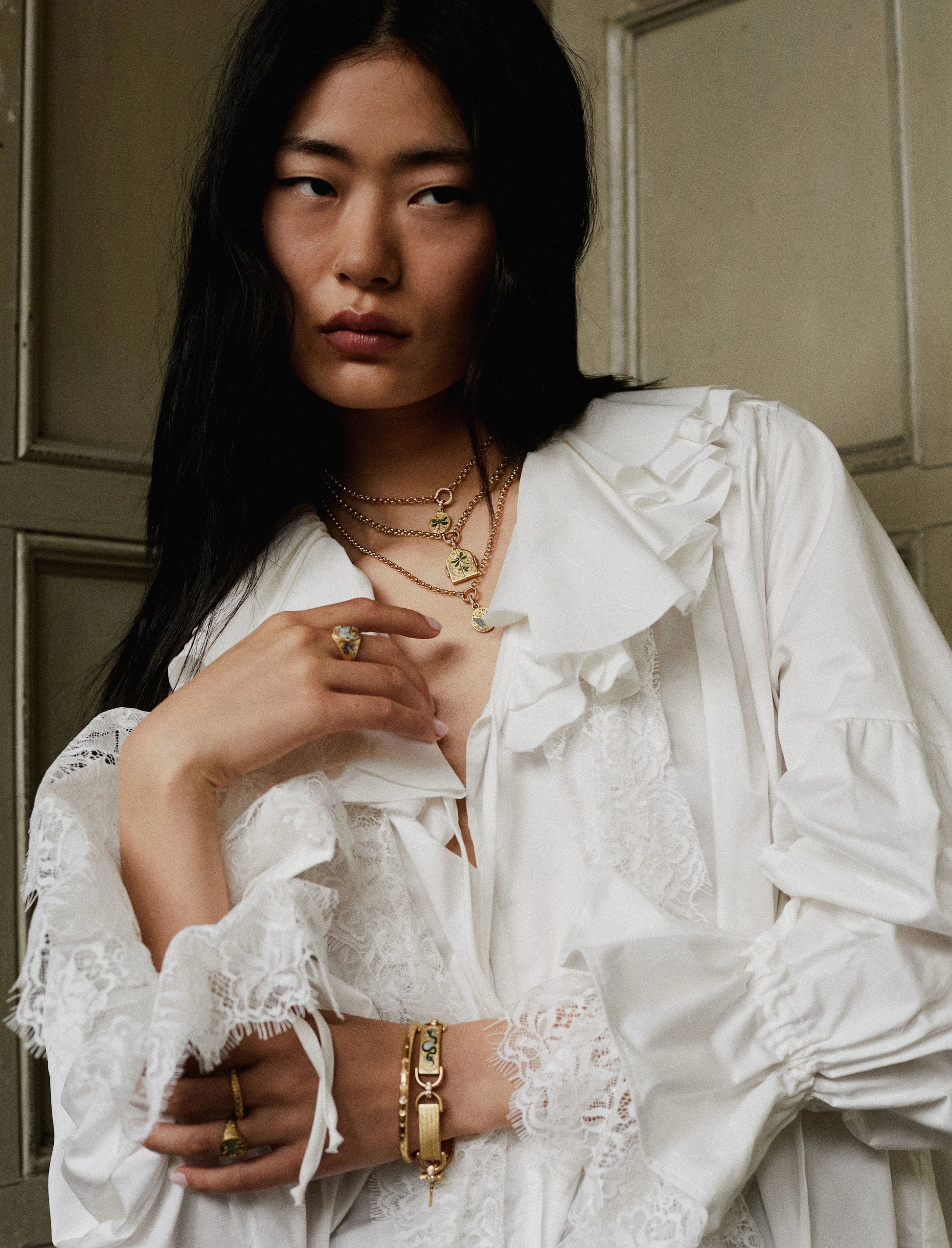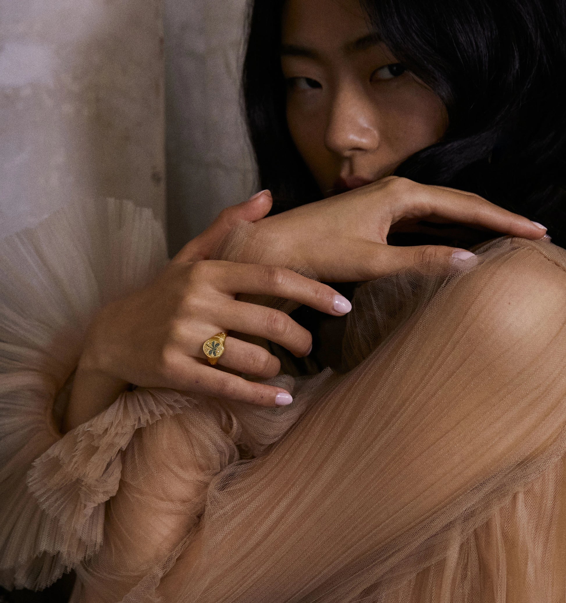 Each ring starts its journey in Cece’s London workshop, made by hand and forged from beautifully deep and rich recycled 18ct yellow gold. The ring is then passed on to one of London’s most renowned enamelers where every design is hand engraved and then hand painted using fire and crushed glass to create each design perfectly. Finally, the ring is embellished with pearls and star-set diamonds to complete each miniature scene. This meticulous and precious process means every ring is individual to the wearer, a mystical heirloom that will last generations.