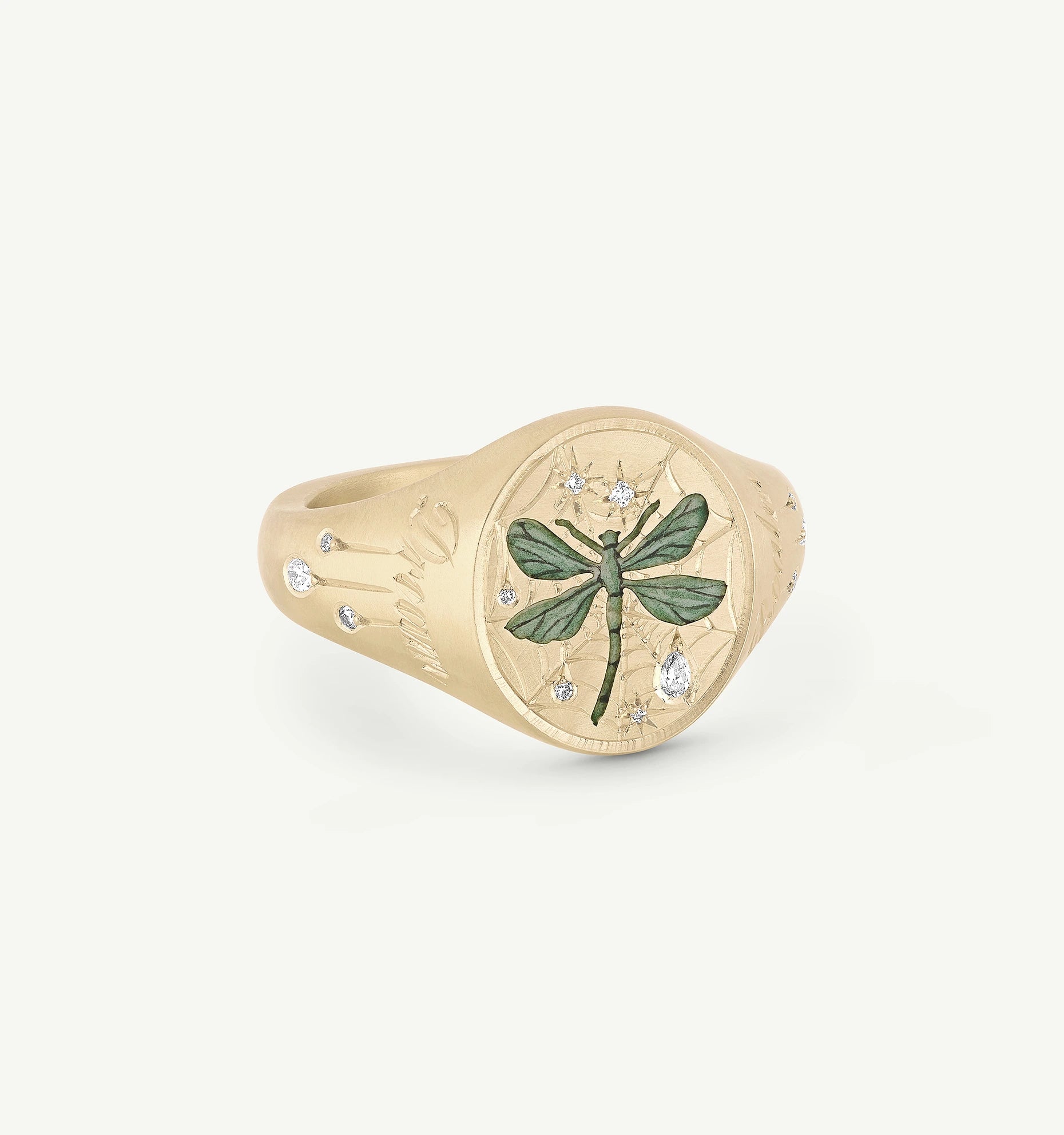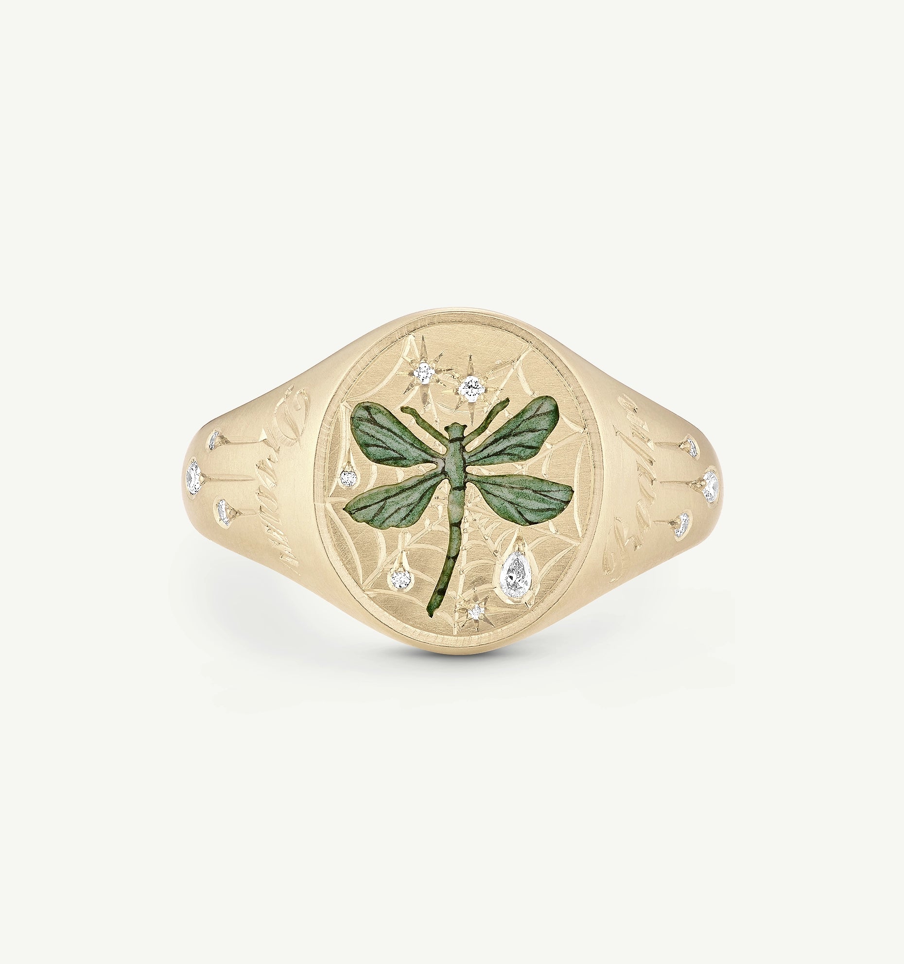 Crafted in 18ct gold with Champlevé enamel and diamonds, the signet ring is finished with hand-engraved details on each shoulder and glittering, diamond-set stars.