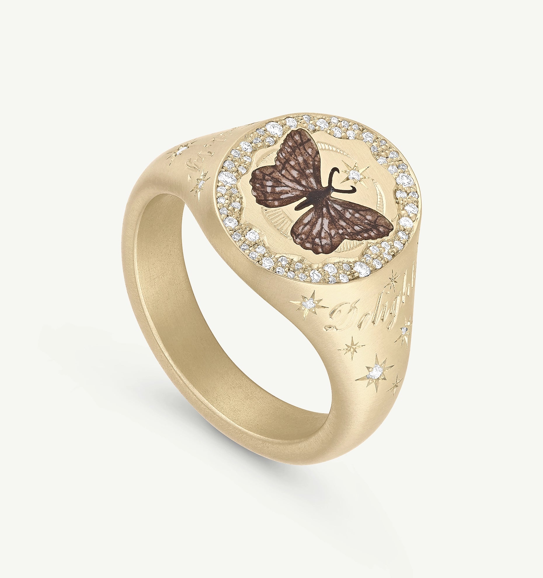 A fleeting moment of beauty, caught in gold. The butterfly, its delicate wings captured in ethereal hand-painted enamel, alights a moment on your finger.