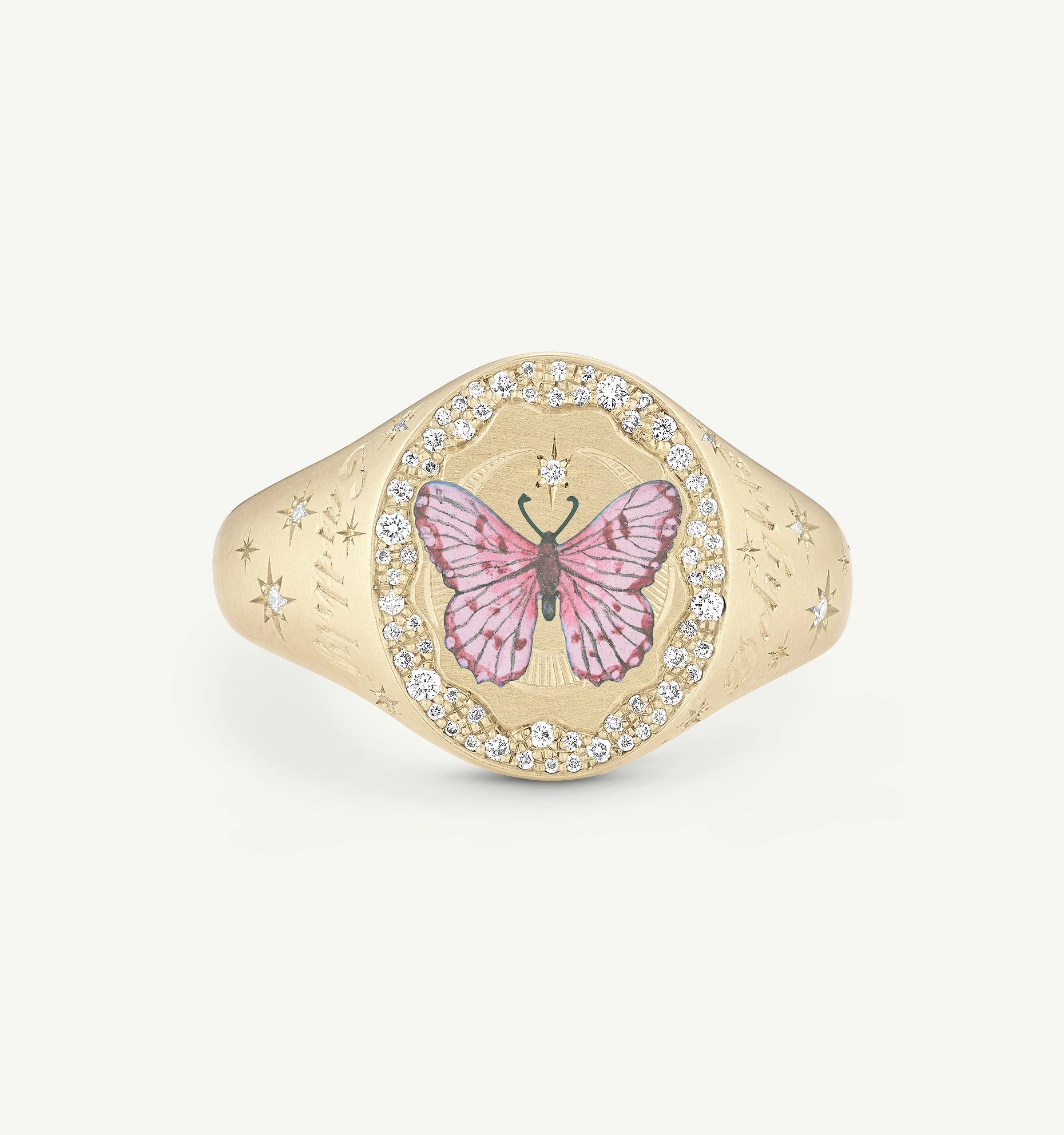 Each ring starts its journey in Cece’s London workshop, made by hand and forged from beautifully deep and rich recycled 18ct yellow gold. The ring is then passed on to one of London’s most renowned enamelers where every design is hand engraved and then hand painted using fire and crushed glass to create each design perfectly. Finally, the ring is embellished with pearls and star-set diamonds to complete each miniature scene. This meticulous and precious process means every ring is individual to the wearer, a mystical heirloom that will last generations.