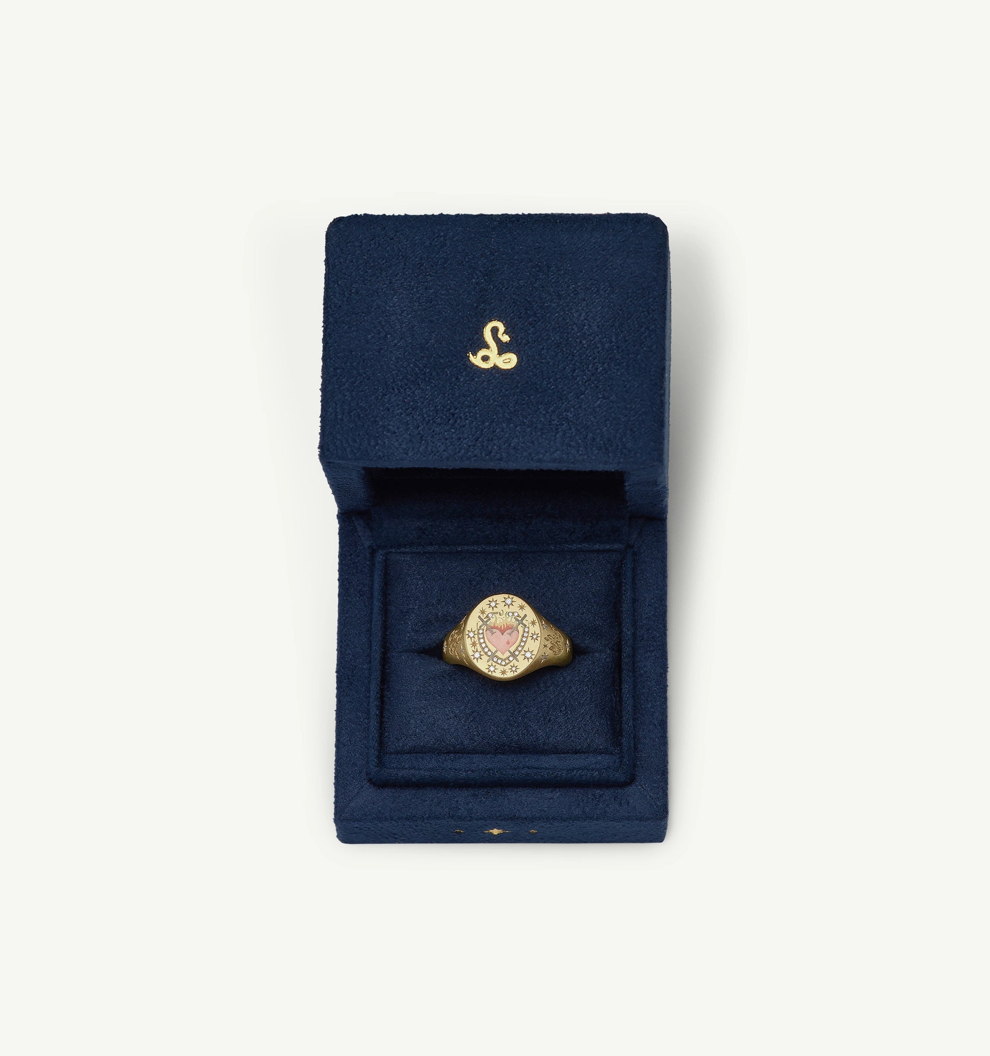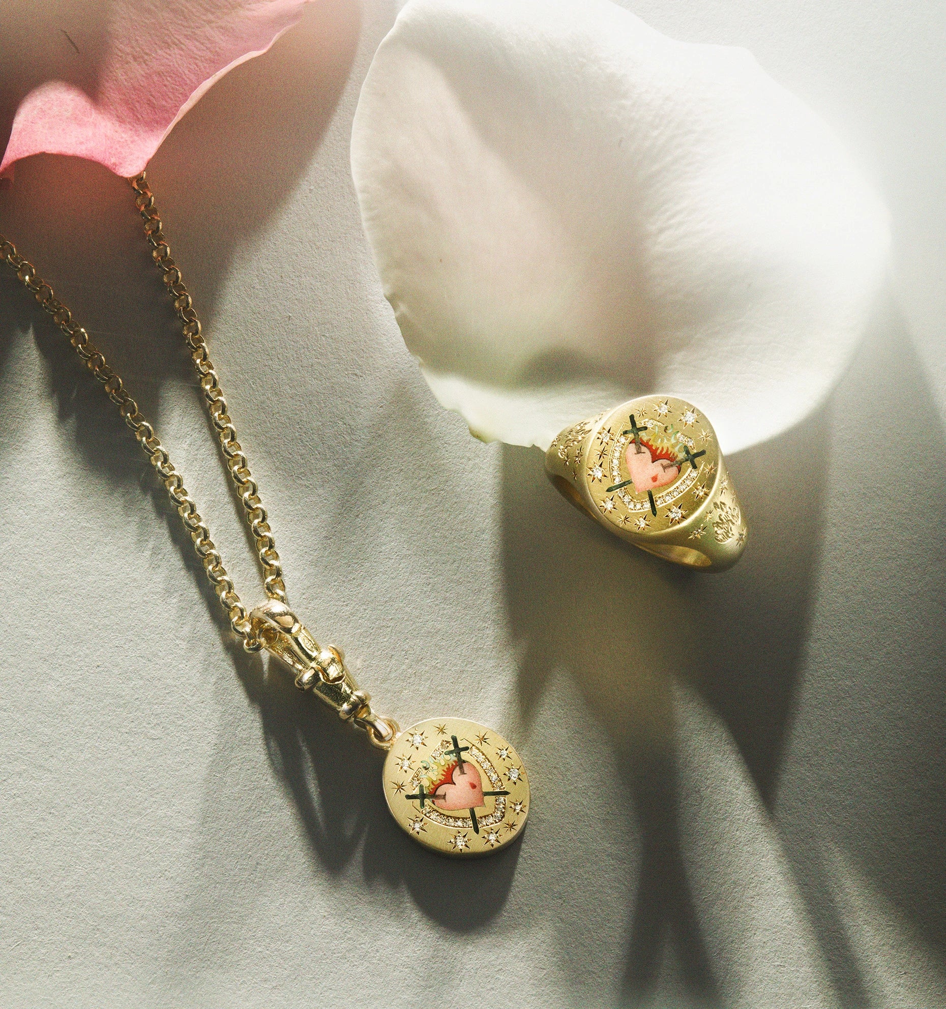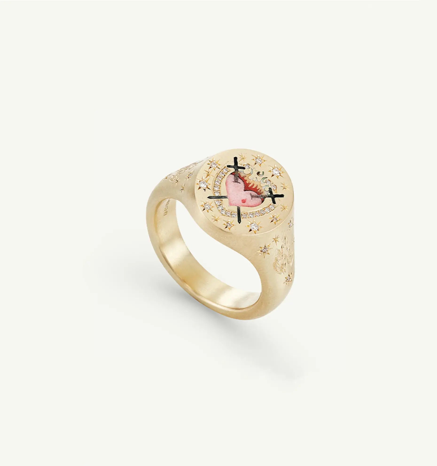 Each ring starts its journey in Cece’s London workshop, made by hand and forged from beautifully deep and rich recycled 18ct yellow gold. The ring is then passed on to one of London’s most renowned enamelers where every design is hand engraved and then hand painted using fire and crushed glass to create each design perfectly. Finally, the ring is embellished with pearls and star-set diamonds to complete each miniature scene. This meticulous and precious process means every ring is individual to the wearer, a mystical heirloom that will last generations.