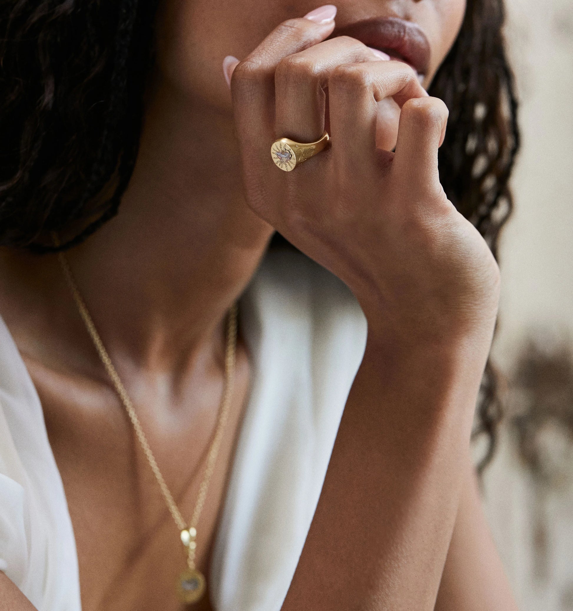 Each ring starts its journey in Cece’s London workshop, made by hand and forged from beautifully deep and rich recycled 18ct yellow gold. The ring is then passed on to one of London’s most renowned enamelers where every design is hand engraved and then hand painted using fire and crushed glass to create each design perfectly. Finally, the ring is embellished with pearls and star-set diamonds to complete each miniature scene. This meticulous and precious process means every ring is individual to the wearer, a mystical heirloom that will last generations.