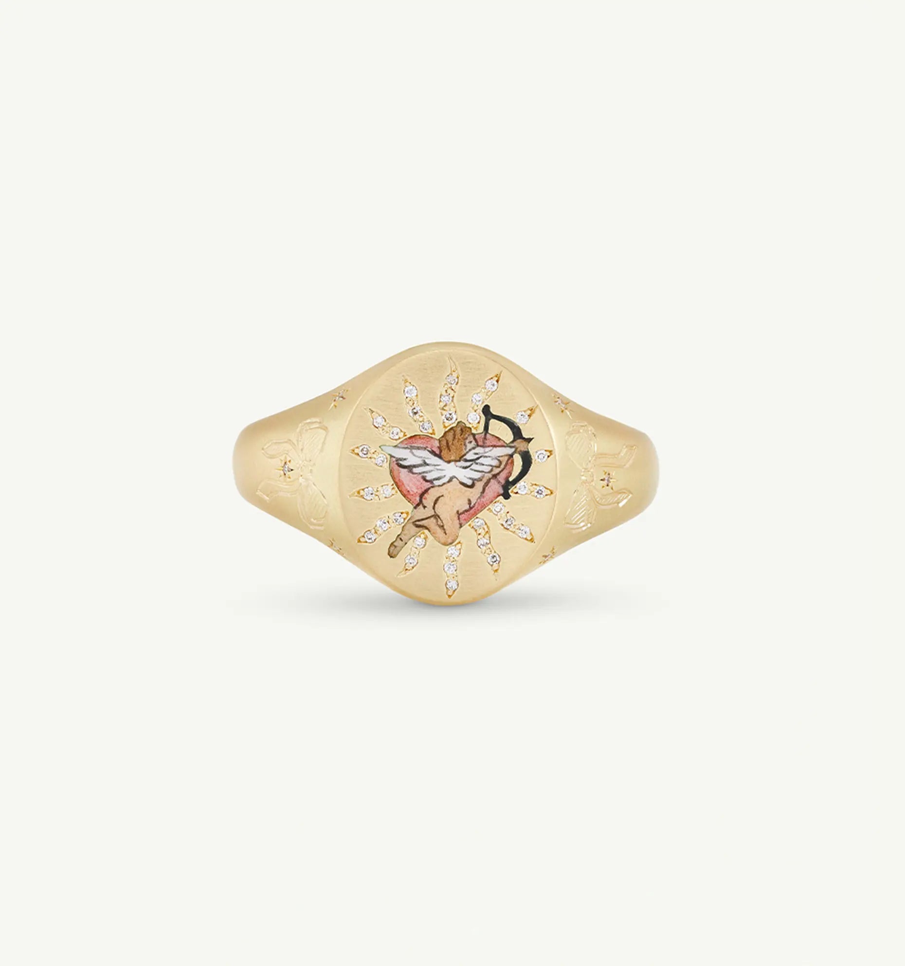 A charming, white-winged cherub takes aim, shooting its arrow toward the target of your heart. The irresistible candy-pink of a tactile heart makes a playful backdrop, radiating with diamond-set sun rays in a nod to the all-encompassing joy of love.