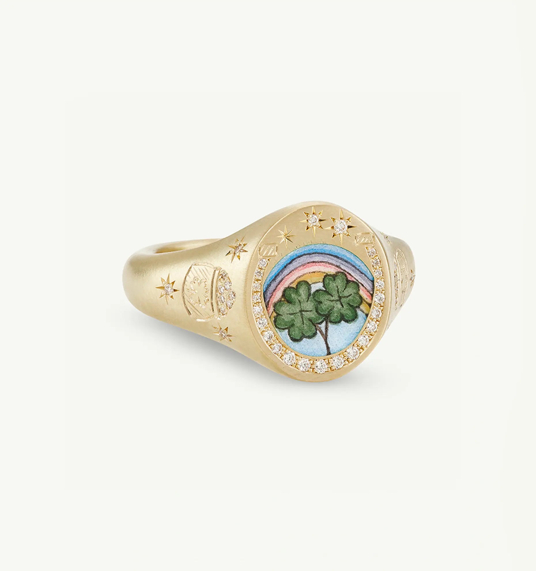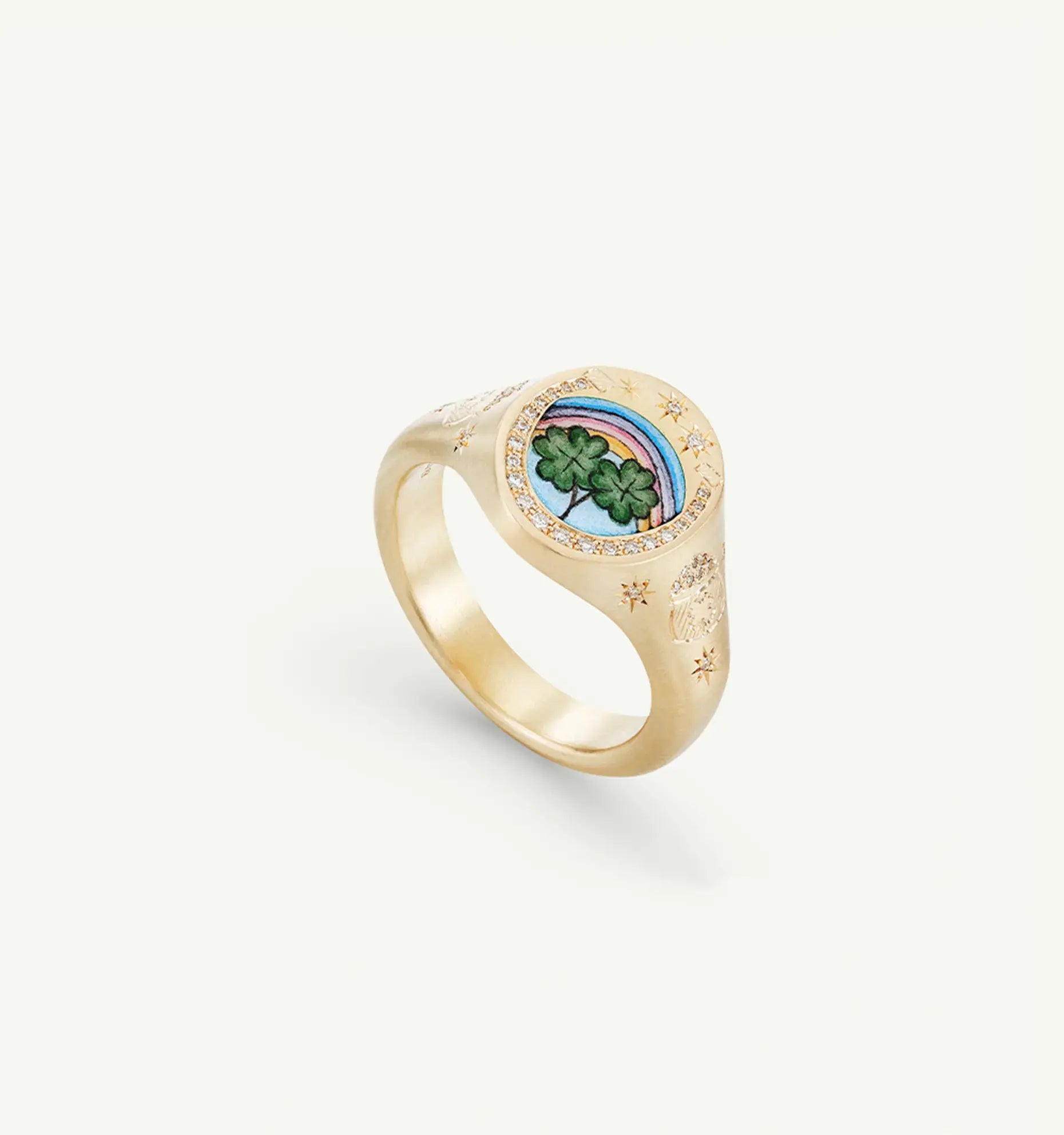 On your hand-enamelled Luck ring, you’ll find not one but two four-leaf clovers inside a diamond-set horseshoe. A glorious enamelled rainbow bestows even more good fortune, leading you to the metaphorical gold.