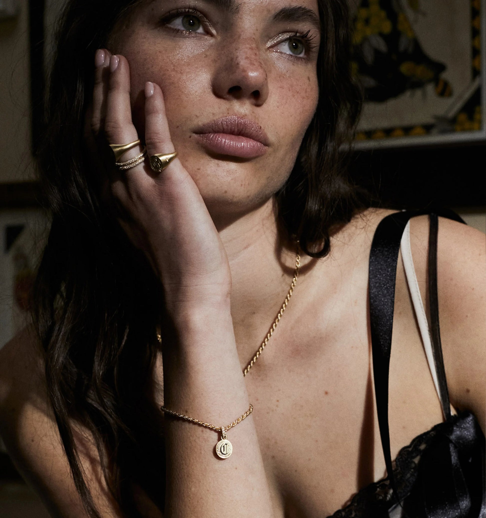 Held at the centre of a tactile, rope chain bracelet, the medallion is finished with Cece’s distinct star-set diamond and a pavé crescent moon. Graphic and luxurious, it’s unmistakably Cece. Made to live in, it becomes your everyday signature; a mark for life, sans needle.