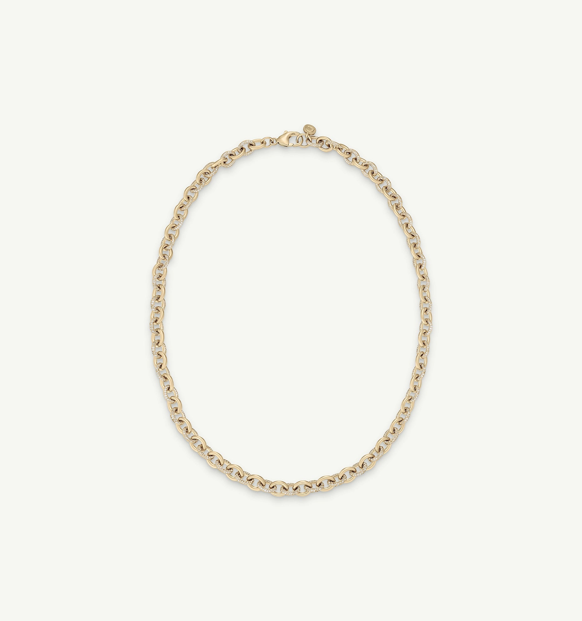 Solid 18ct yellow gold oval links wrap your neck. Bold and sculptural, with selecre link is pavé-set with glittering diamonds for a play of texture and finish.