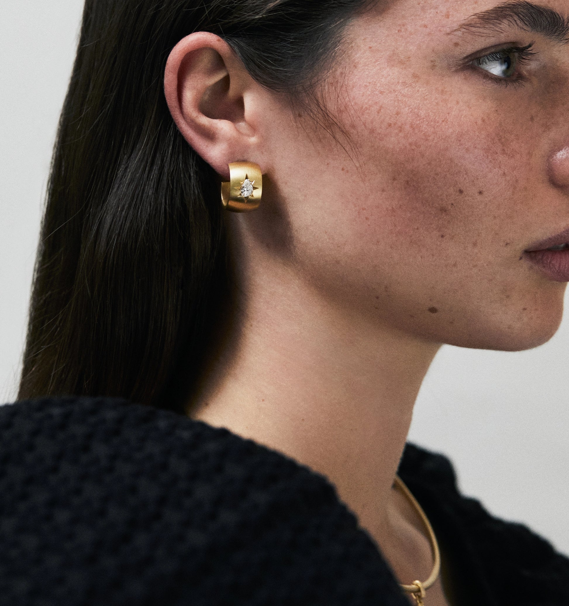 The Come Rain Or Shine Diamond Hoops revel in the beauty of this precious material. Crafted in a barrel silhouette, generous curves of 18ct yellow gold are given a tactile frosted finish. With an abundant, rounded profile and secure hinged post fastening, these earrings are as pleasurable to wear as they are on the eye.