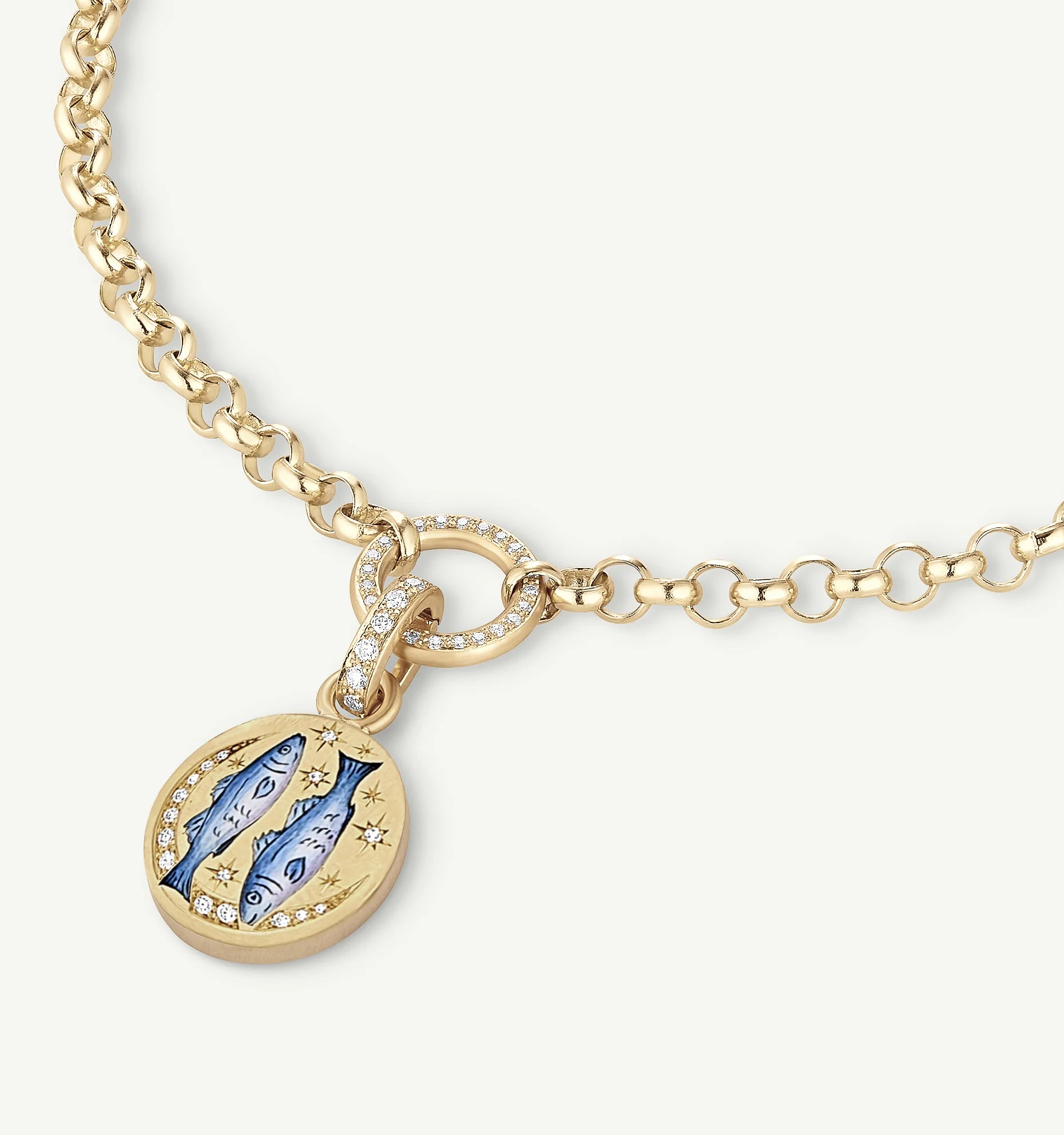 A reminder that life is filled with endless opportunities, this pendant is crafted in 18ct gold with hand-painted enamel and diamonds. Finished with engraving detail, star-set diamonds and a pavé clip.