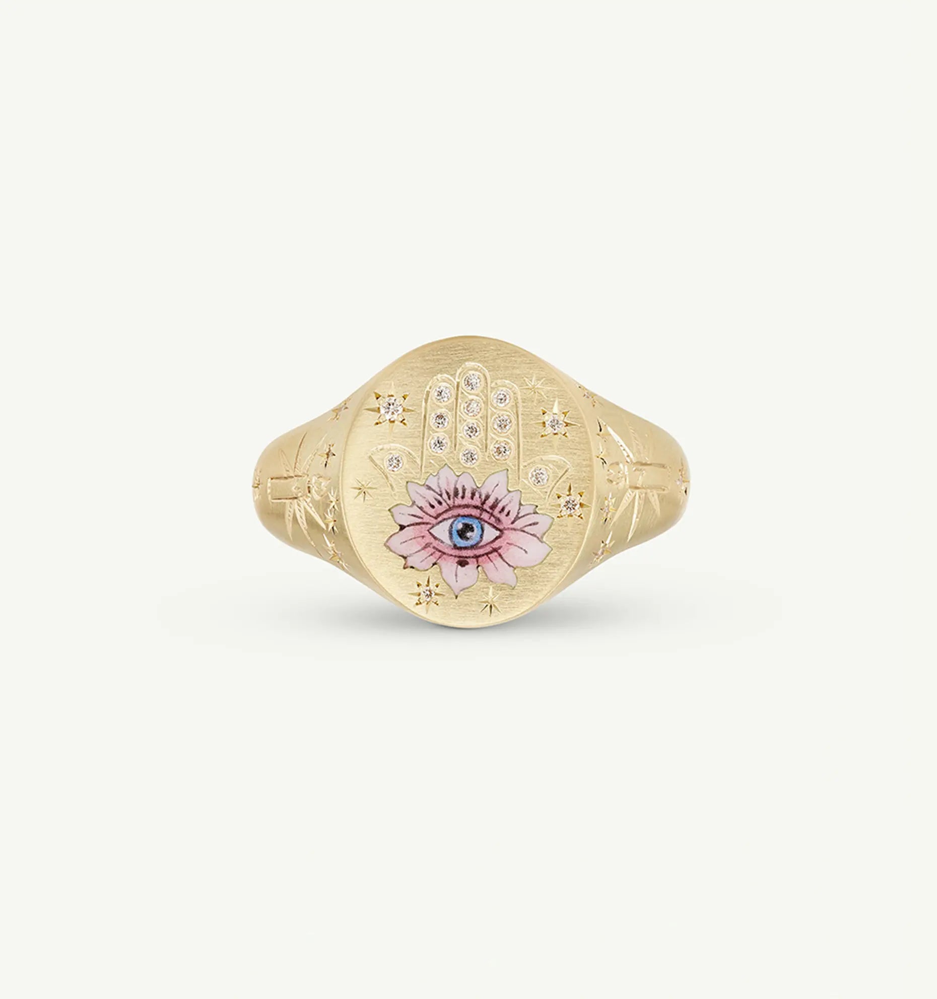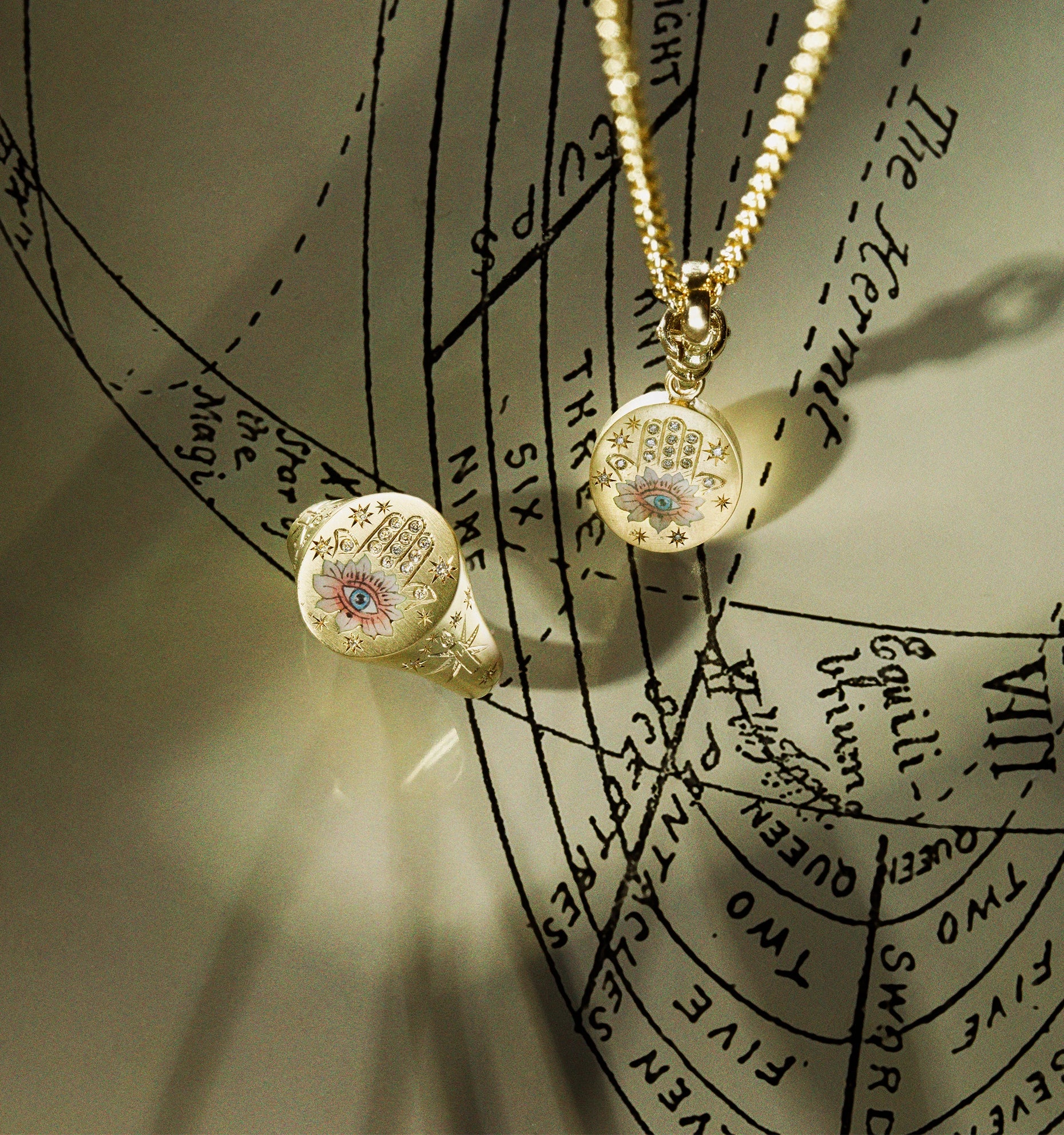 Each ring starts its journey in Cece’s London workshop, made by hand and forged from beautifully deep and rich recycled 18ct yellow gold. The ring is then passed on to one of London’s most renowned enamelers where every design is hand engraved and then hand painted using fire and crushed glass to create each design perfectly. Finally, the ring is embellished with pearls and star-set diamonds to complete each miniature scene. This meticulous and precious process means every ring is individual to the wearer, a mystical heirloom that will last generations.