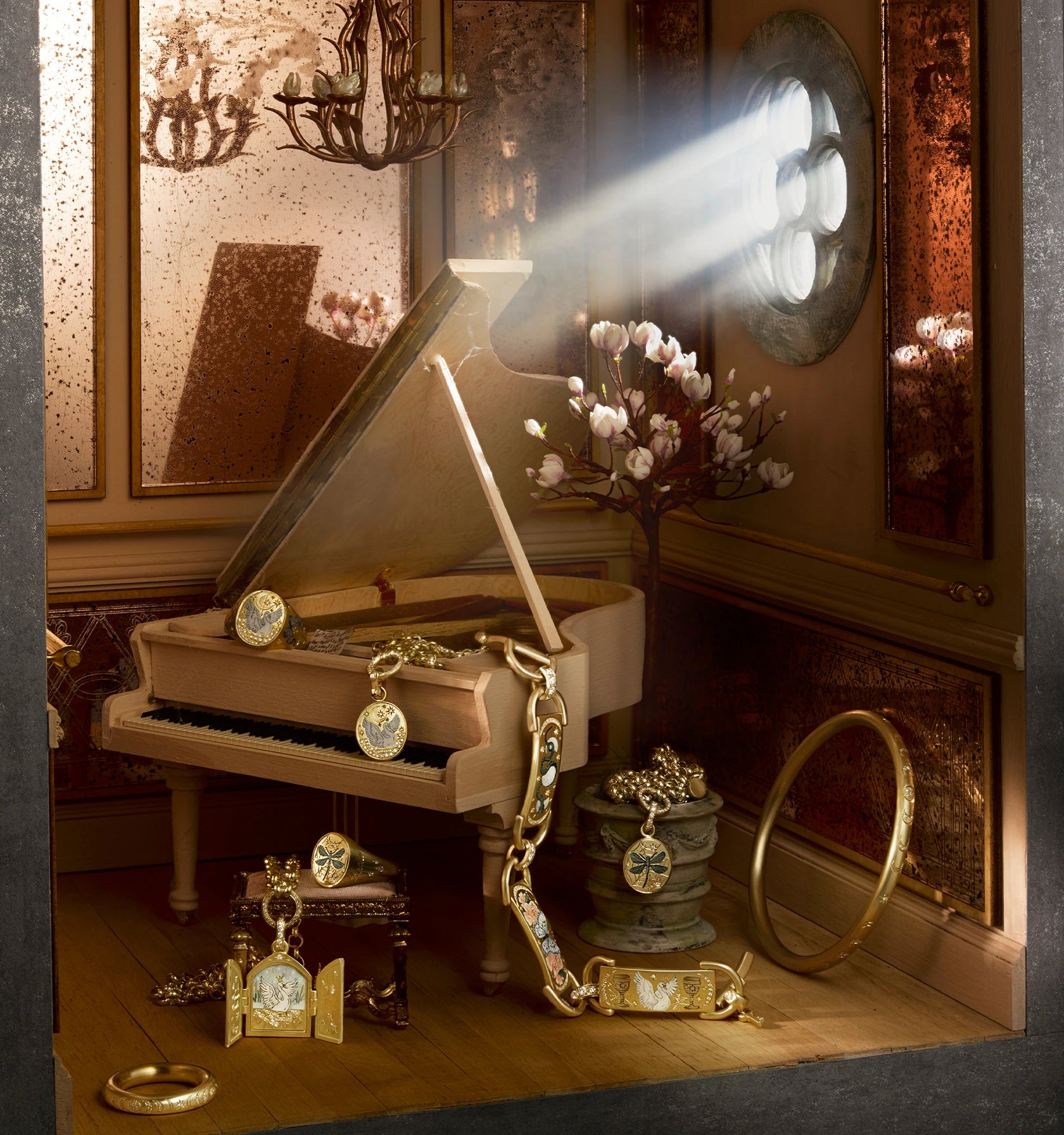Each ring starts its journey in Cece’s London workshop, made by hand and forged from beautifully deep and rich recycled 18ct yellow gold. The ring is then passed on to one of London’s most renowned enamelers where every design is hand engraved and then hand painted using fire and crushed glass to create each design perfectly. Finally, the ring is embellished with pearls and star-set diamonds to complete each miniature scene. This meticulous and precious process means every ring is individual to the wearer, a mystical heirloom that will last generations.