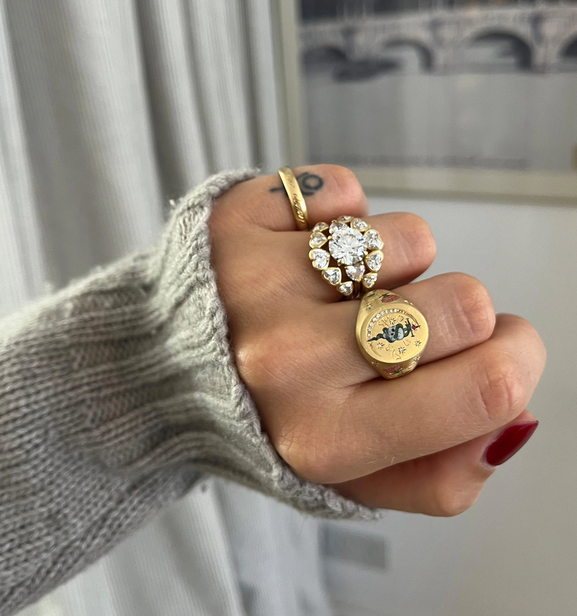 Each ring starts its journey in Cece’s London workshop, made by hand and forged from beautifully deep and rich recycled 18ct yellow gold. The ring is then passed on to one of London’s most renowned enamelers where every design is hand engraved and then hand painted using fire and crushed glass to create each design perfectly. Finally, the ring is embellished with pearls and star-set diamonds to complete each miniature scene. This meticulous and precious process means every ring is individual to the wearer, a mystical heirloom that will last generations.