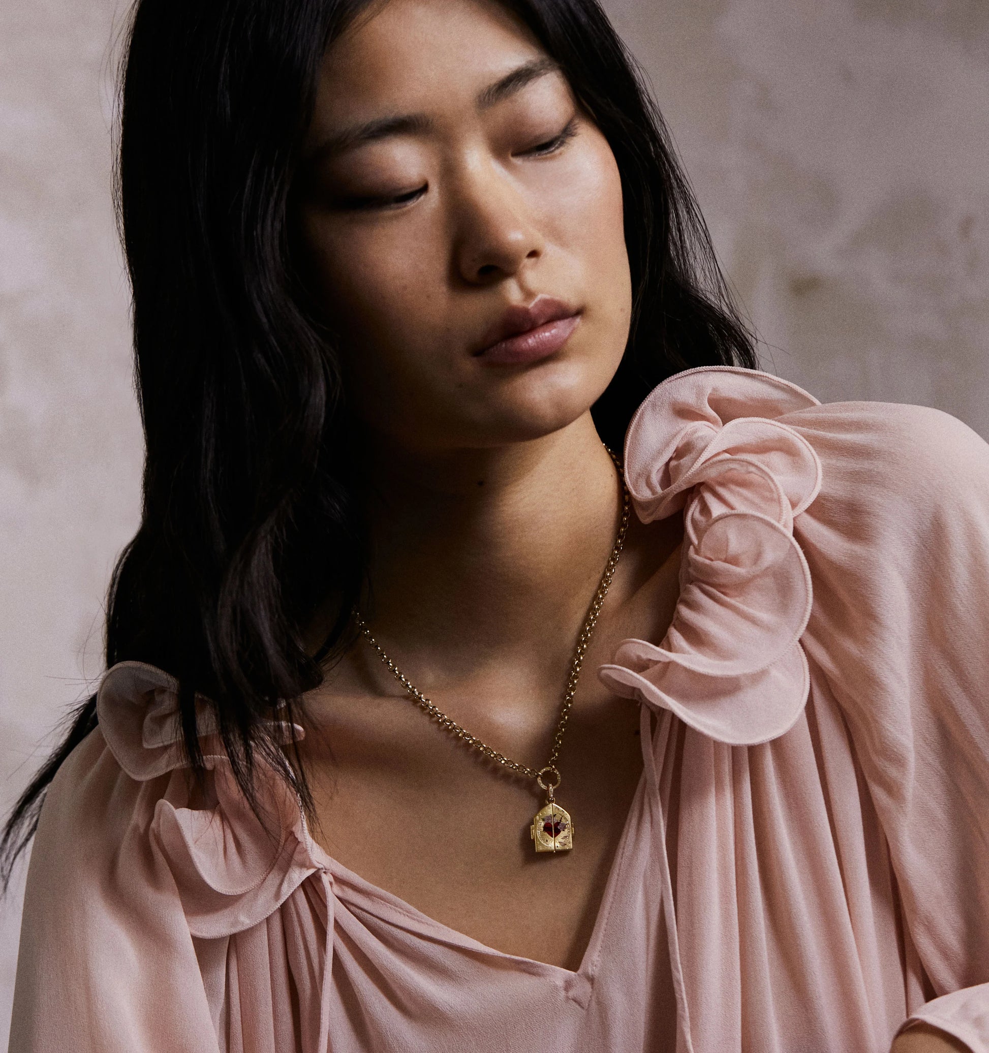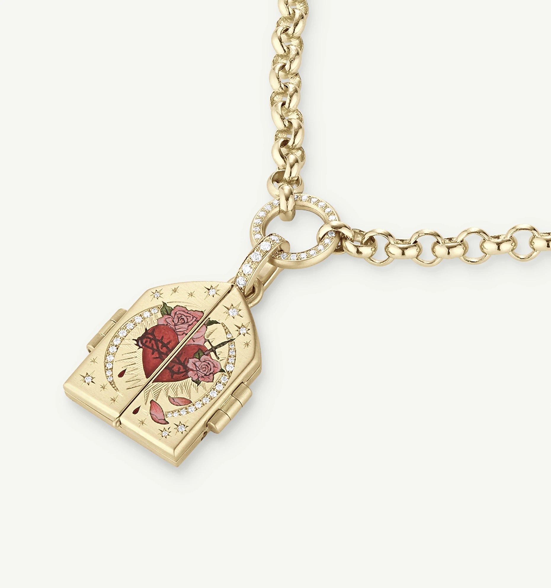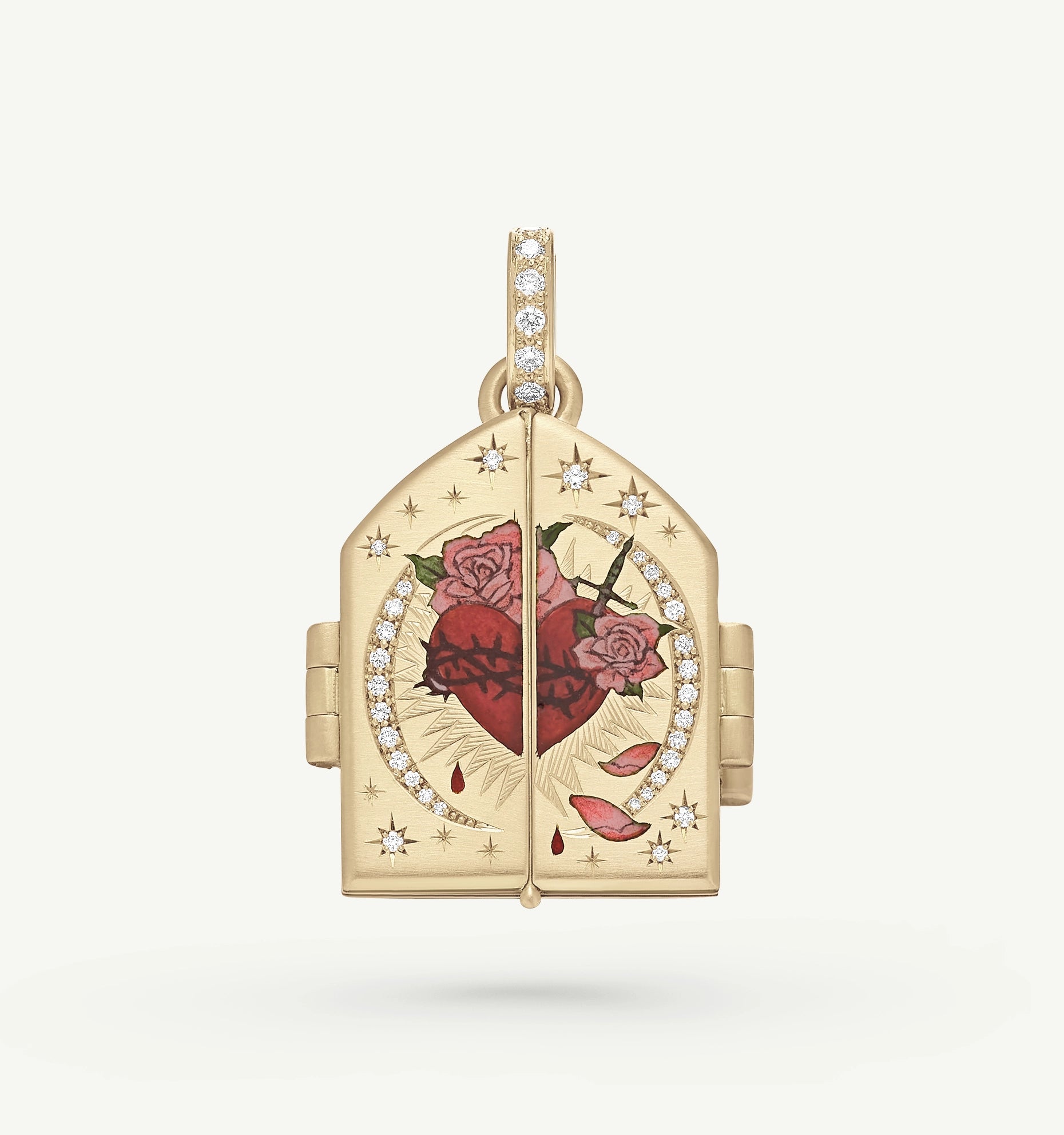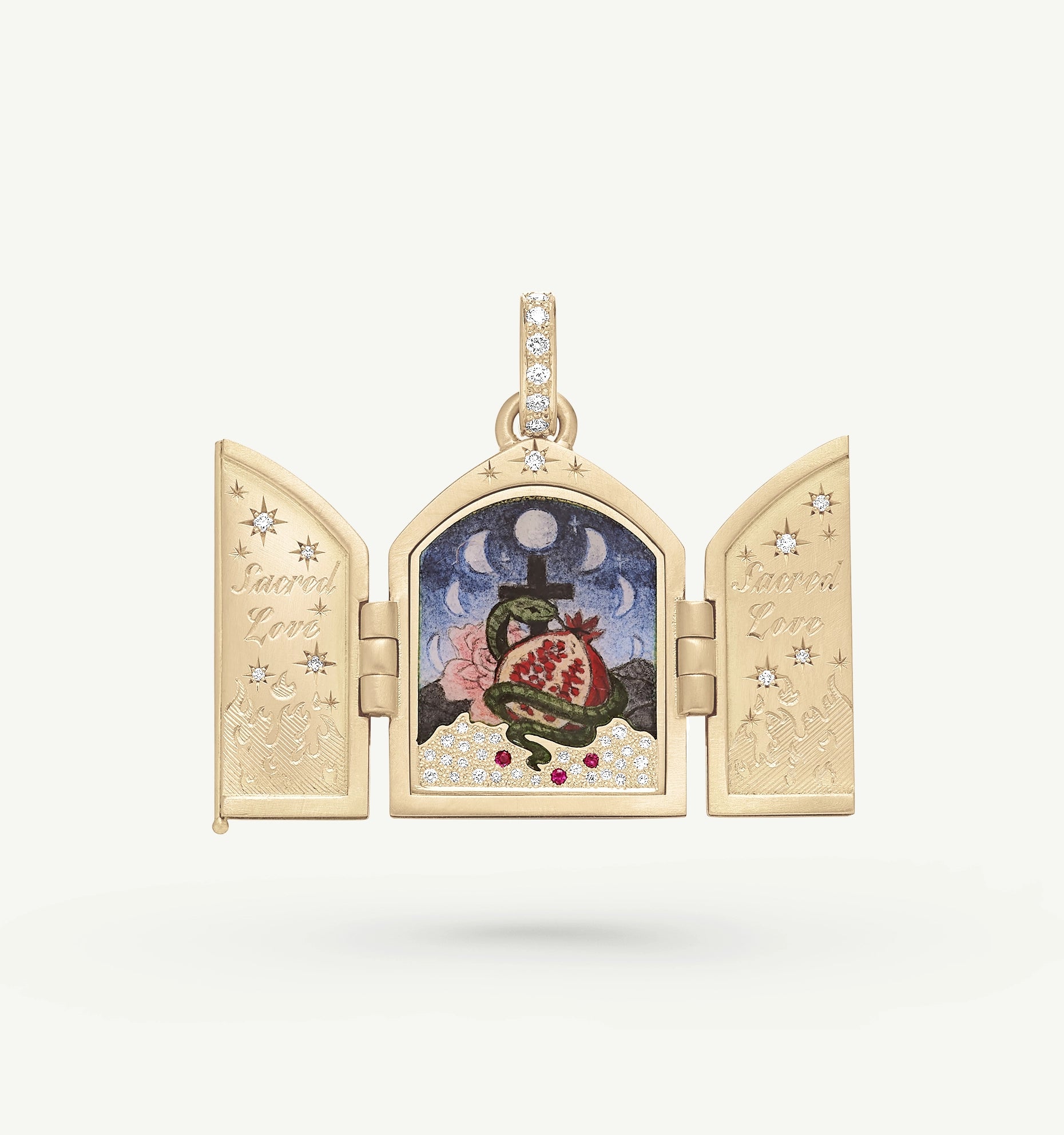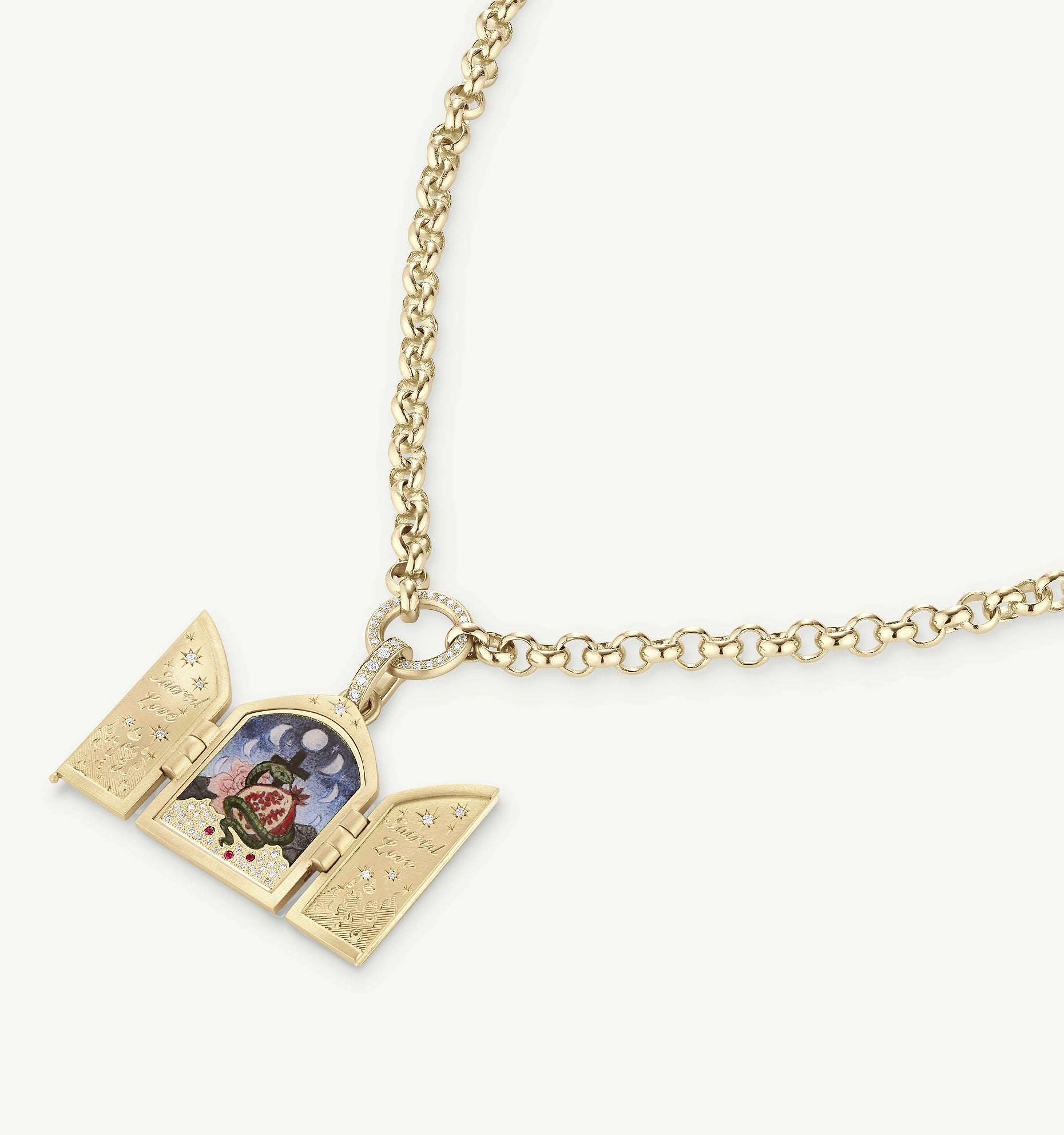 A wearable object de art realised in 18ct gold, hand-painted enamel, diamonds and rubies, the Underworld Triptych creates a sacred space, blanketed in stars. A feast of engraving, enamel and intricate stone-set detail, this extraordinary piece can be worn of the chain of your choice.