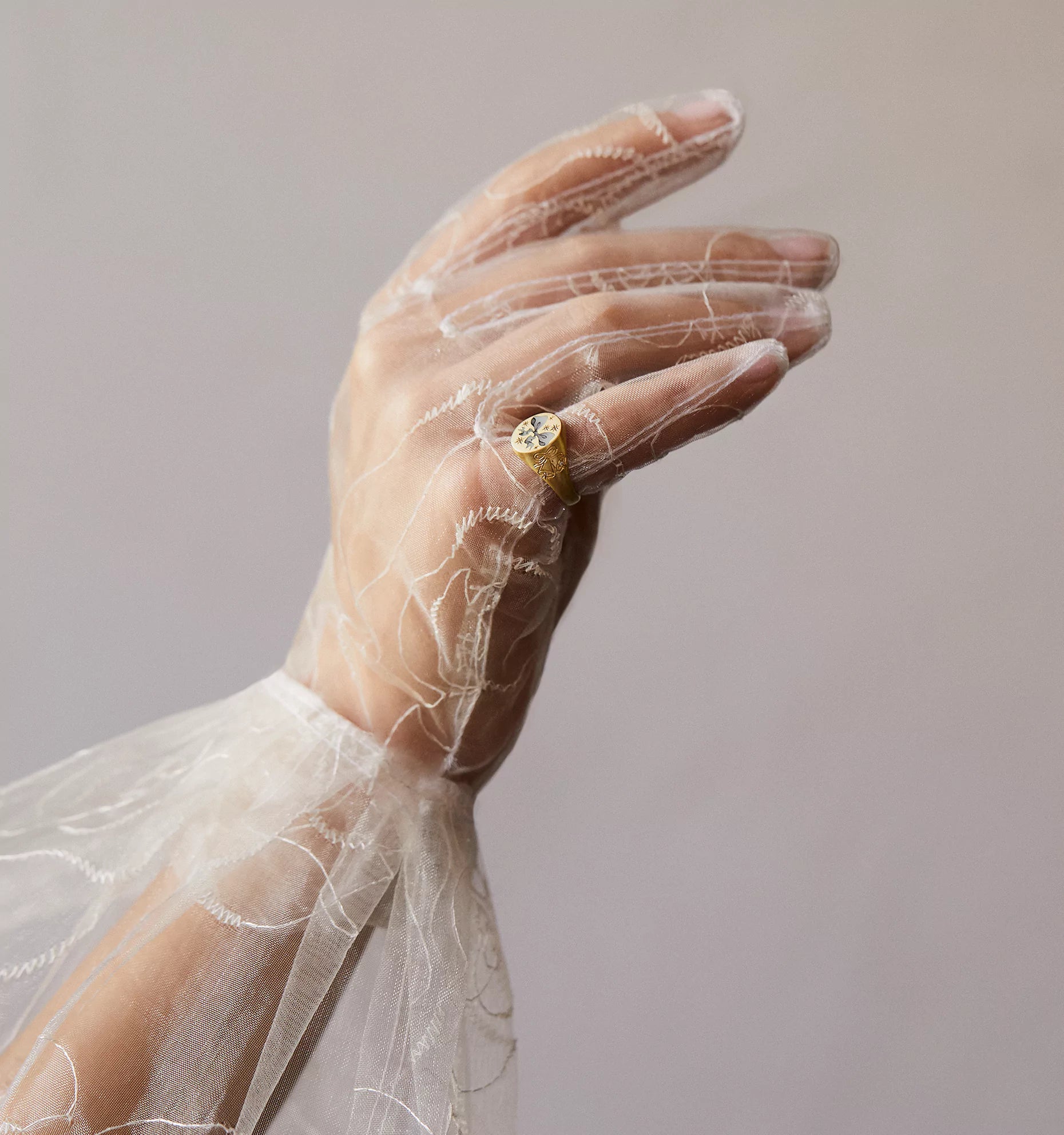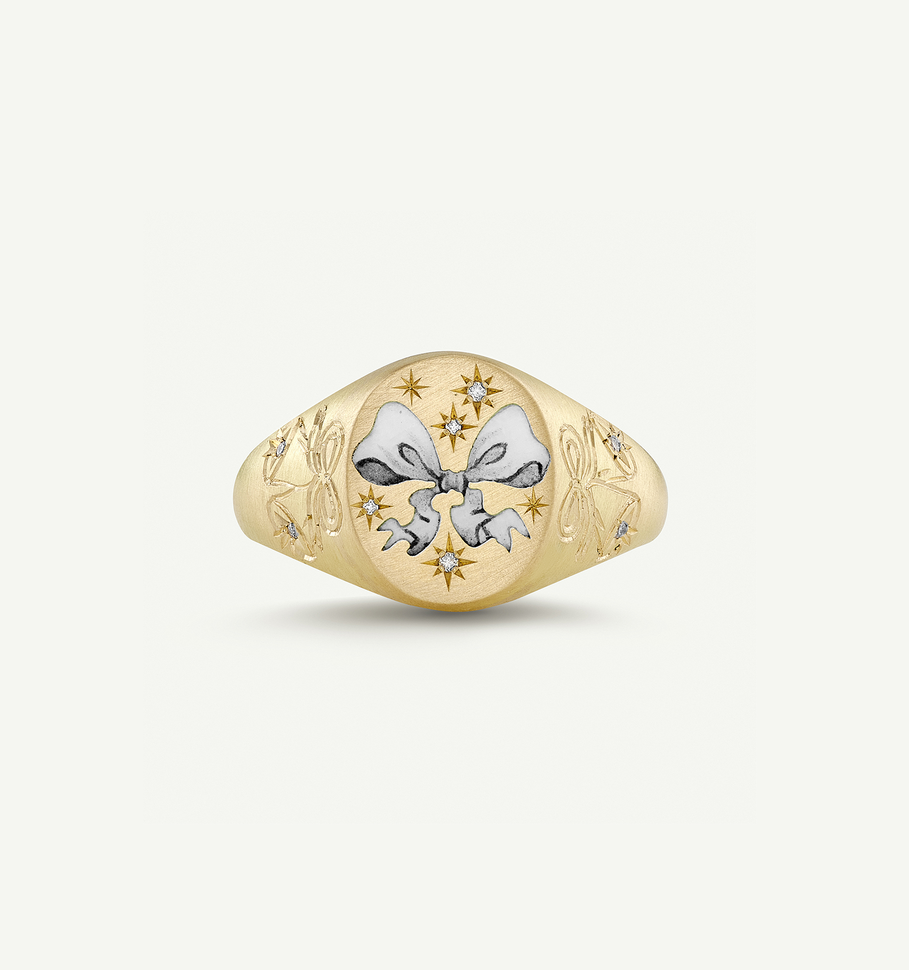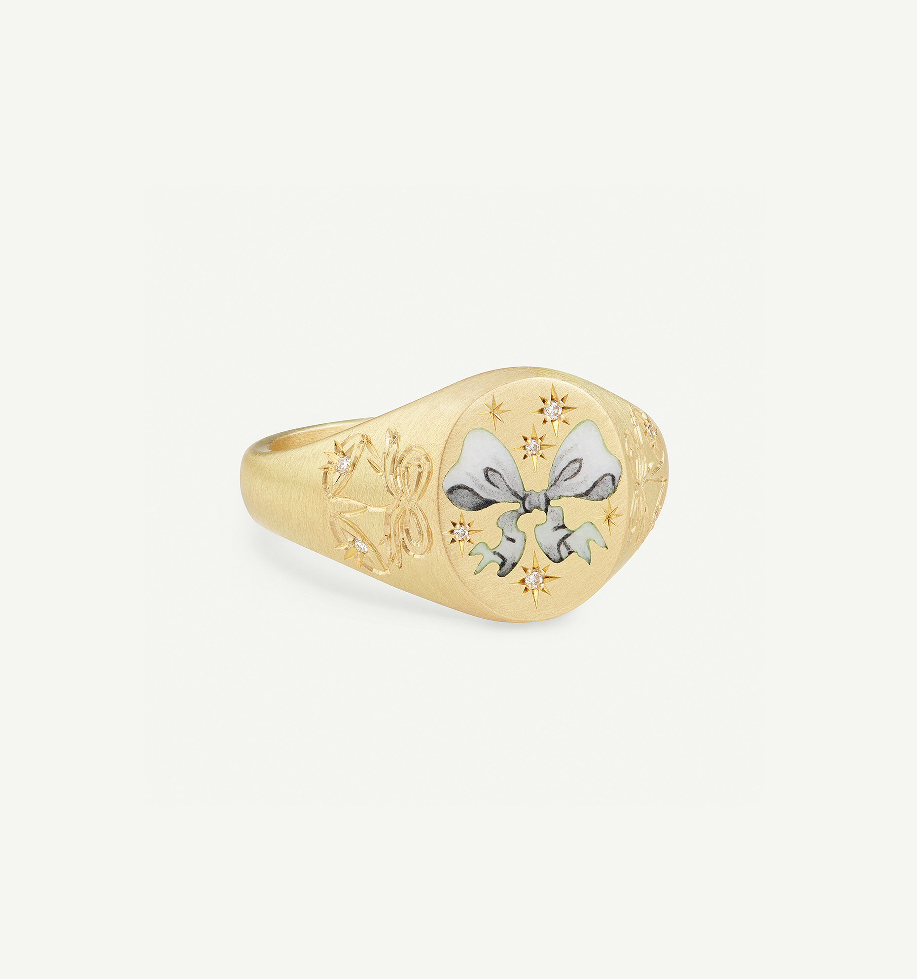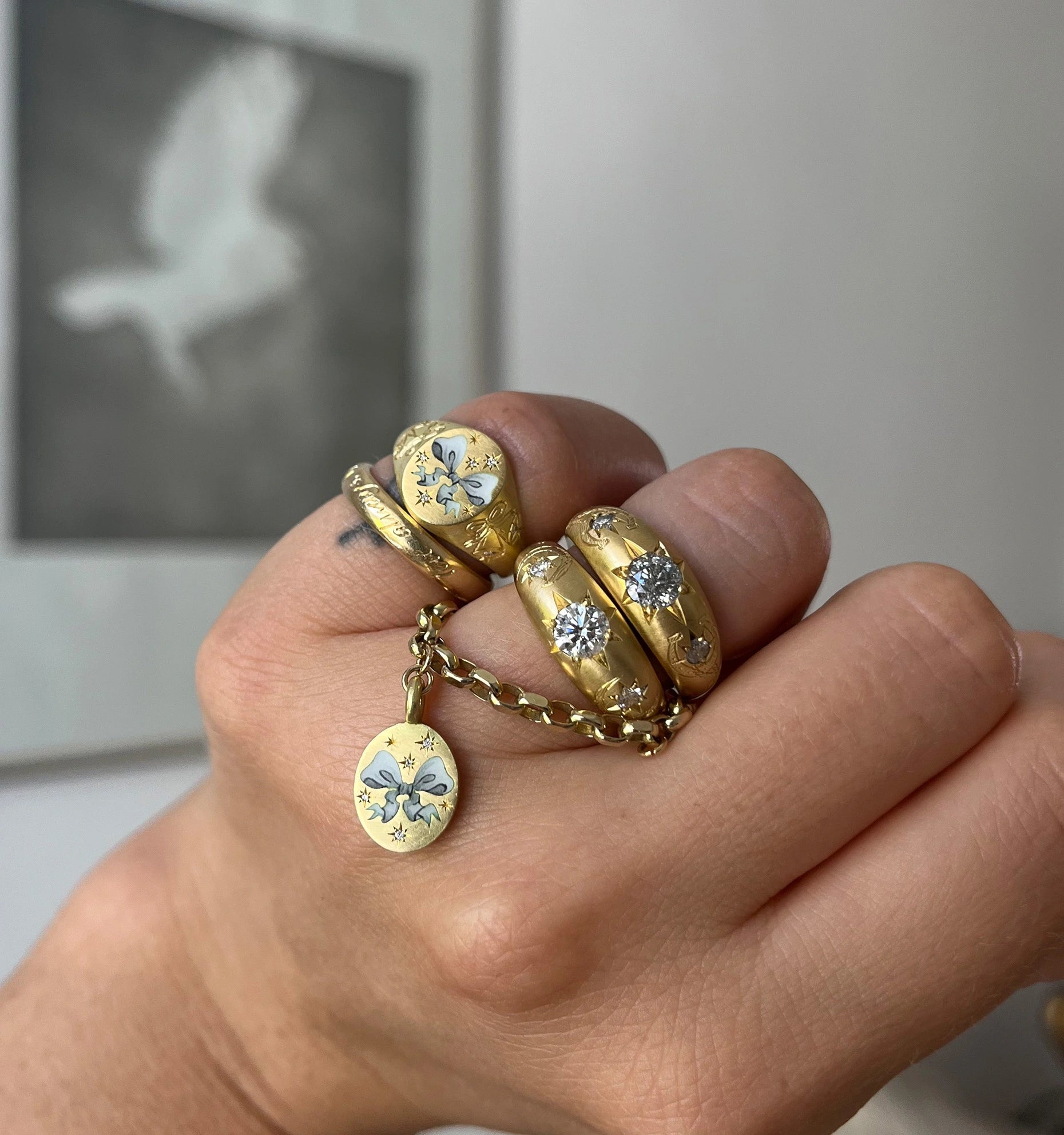 • Each ring starts its journey in Cece’s London workshop, made by hand and forged from beautifully deep and rich recycled 18ct yellow gold. The ring is then passed on to one of London’s most renowned enamelers where every design is hand engraved and then hand painted using fire and crushed glass to create each design perfectly. Finally, the ring is embellished with pearls and star-set diamonds to complete each miniature scene. This meticulous and precious process means every ring is individual to the wearer, a mystical heirloom that will last generations.