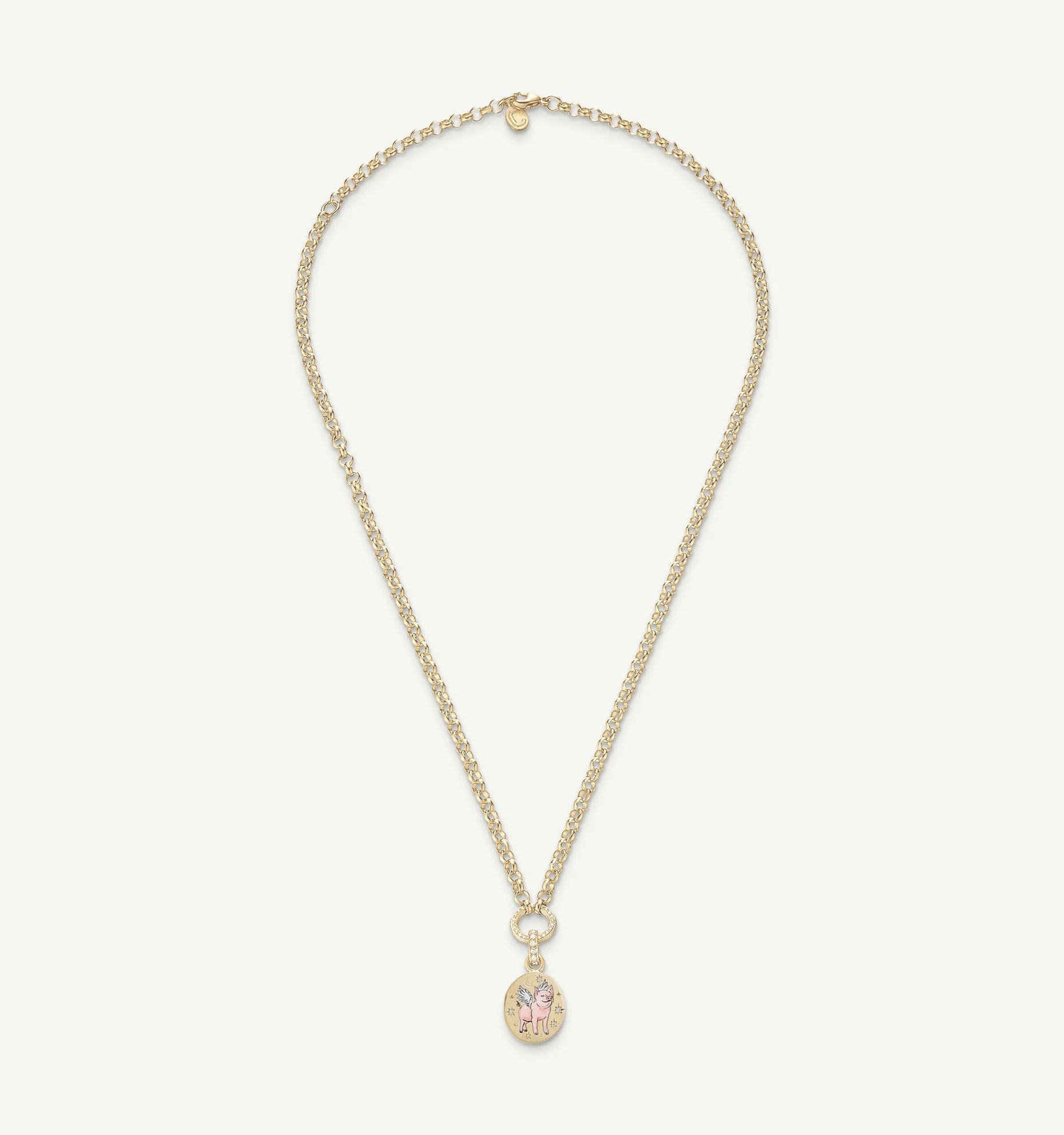 A reminder to believe in the impossible, this pendant is crafted in 18ct gold with hand-painted enamel and diamonds. Finished with engraving detail, star-set diamonds and a pavé clip.