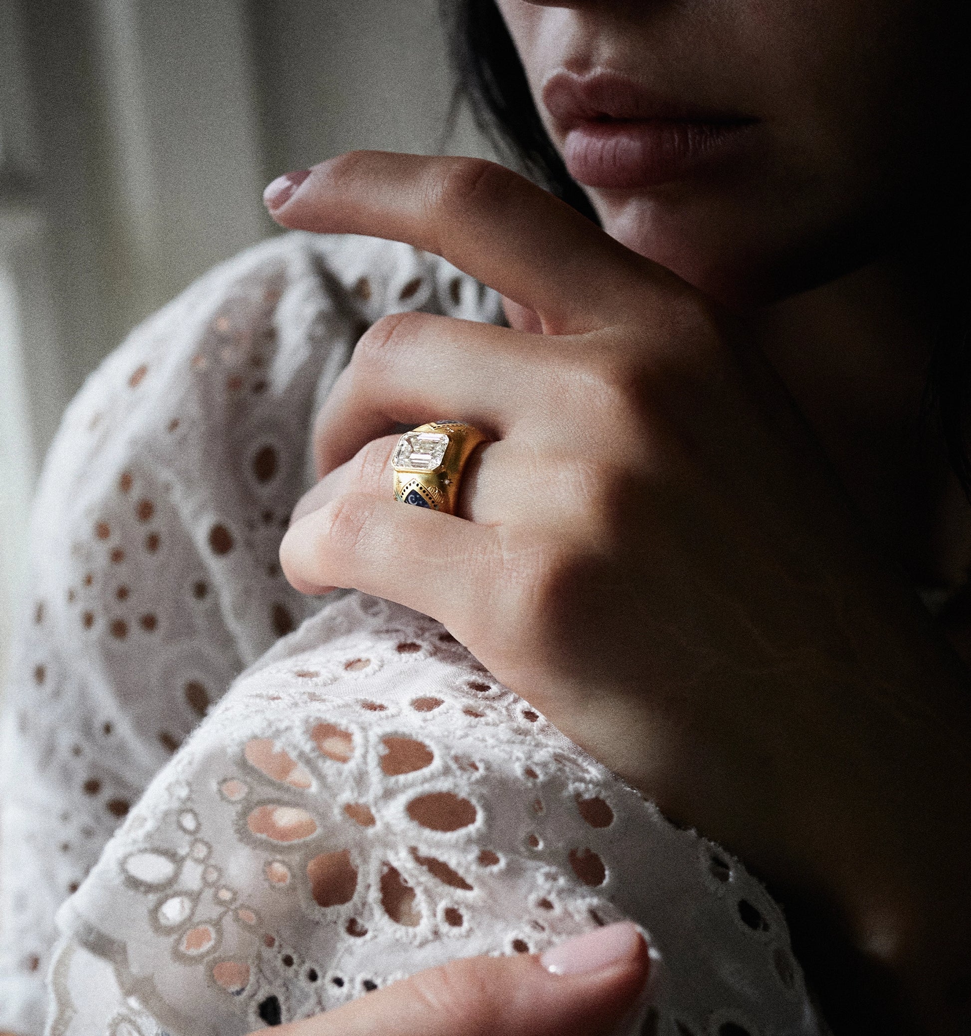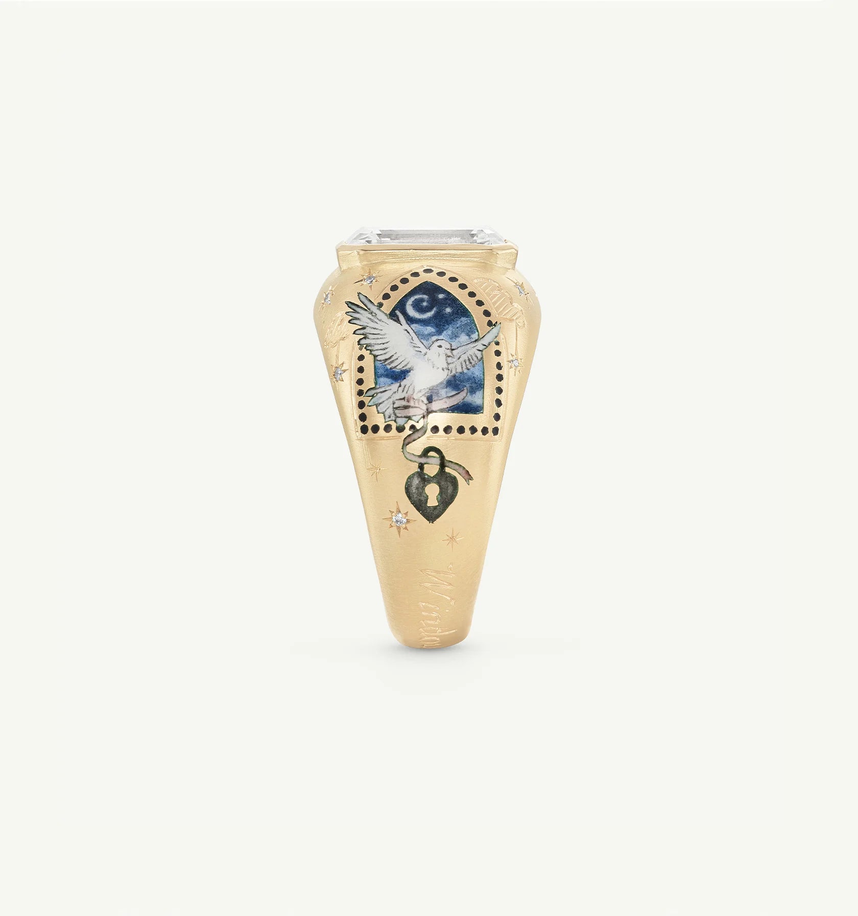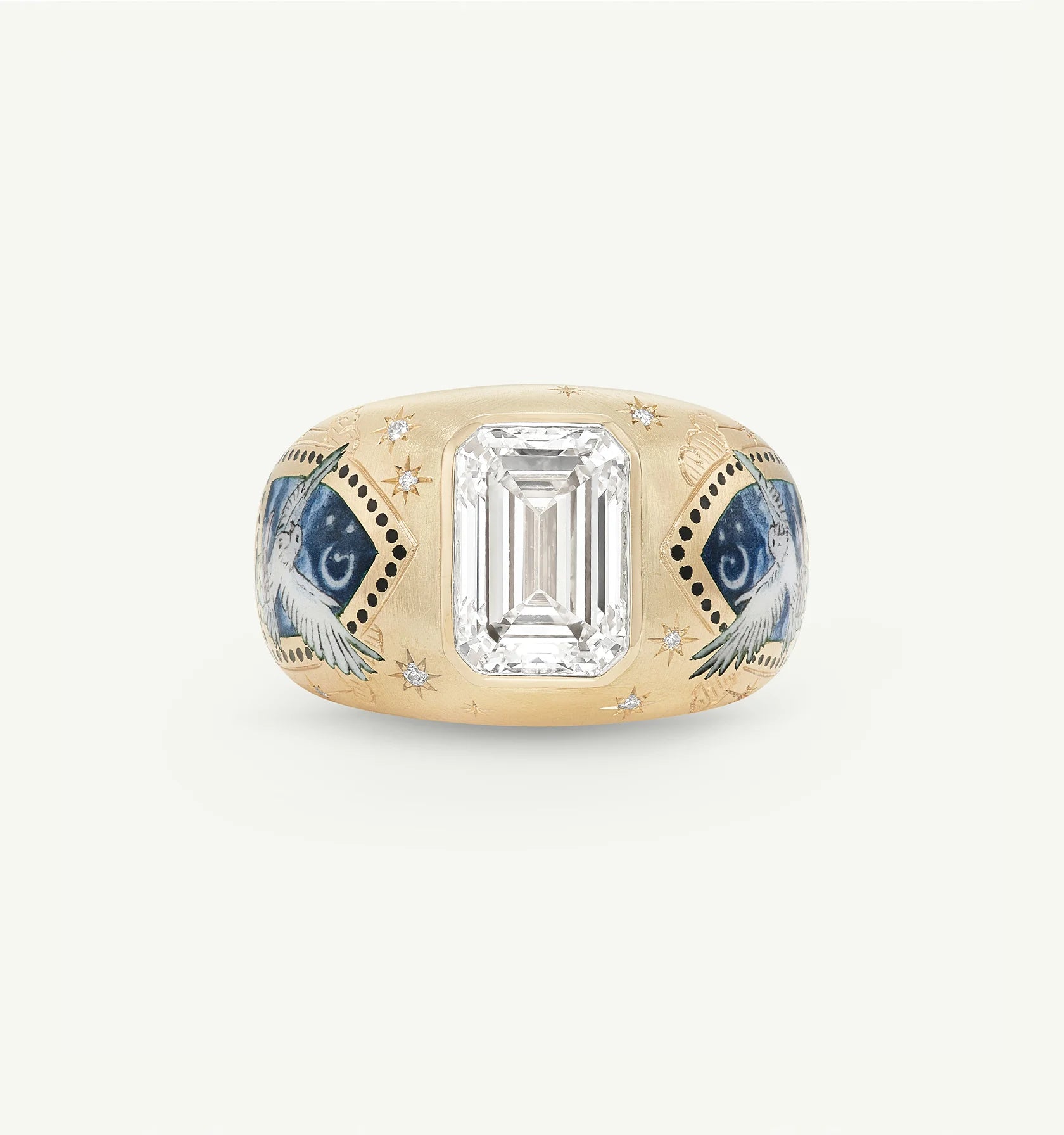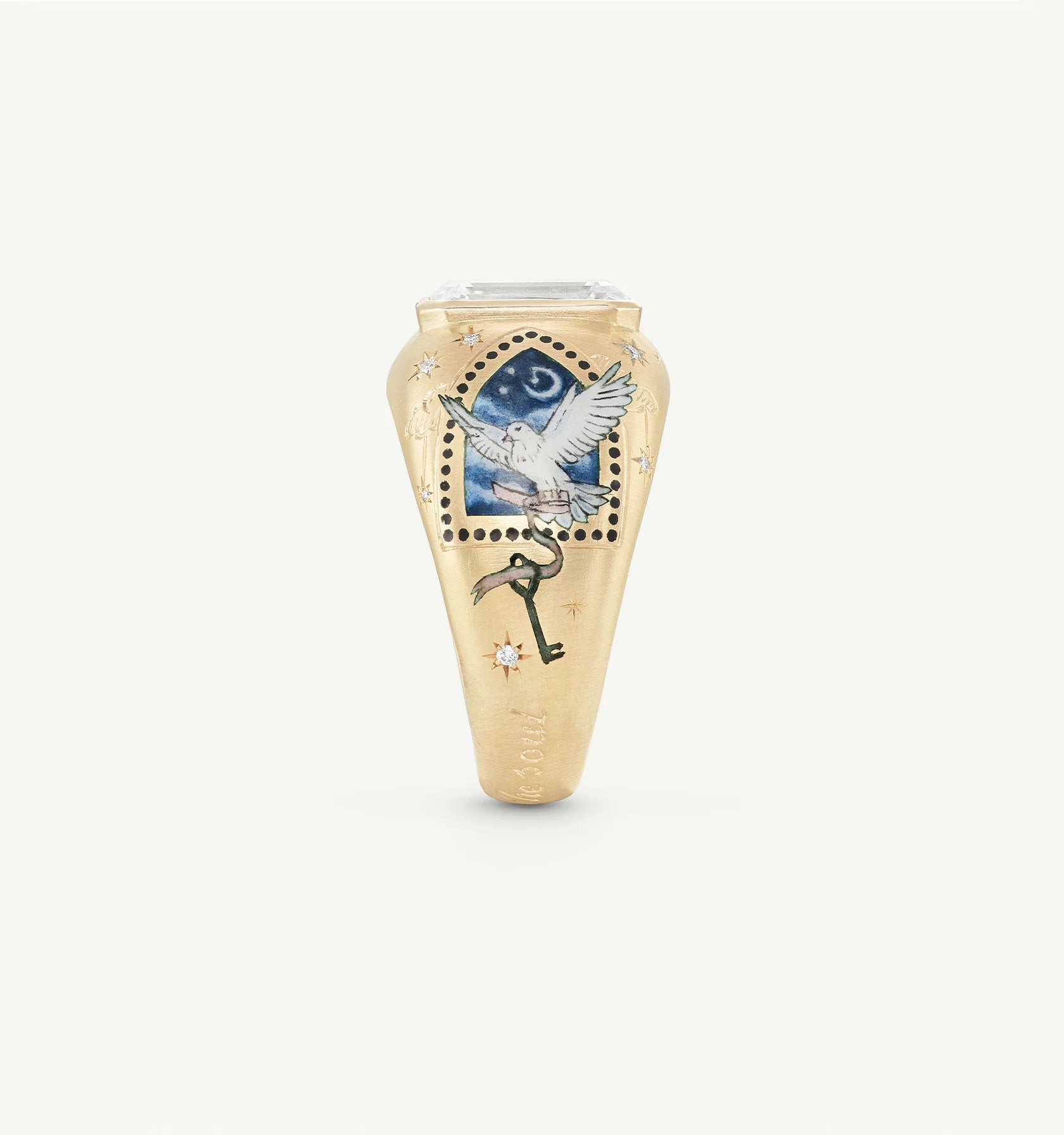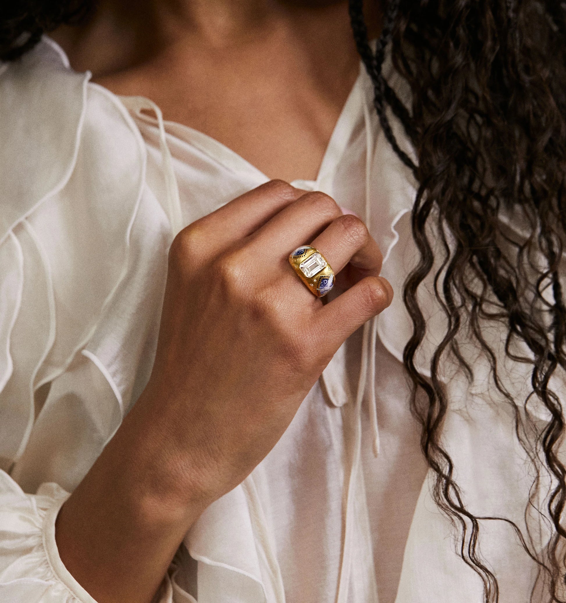 Each ring starts its journey in Cece’s London workshop, made by hand and forged from beautifully deep and rich recycled 18ct yellow gold. The ring is then passed on to one of London’s most renowned enamelers where every design is hand engraved and then hand painted using fire and crushed glass to create each design perfectly. Finally, the ring is embellished with pearls and star-set diamonds to complete each miniature scene. This meticulous and precious process means every ring is individual to the wearer, a mystical heirloom that will last generations.